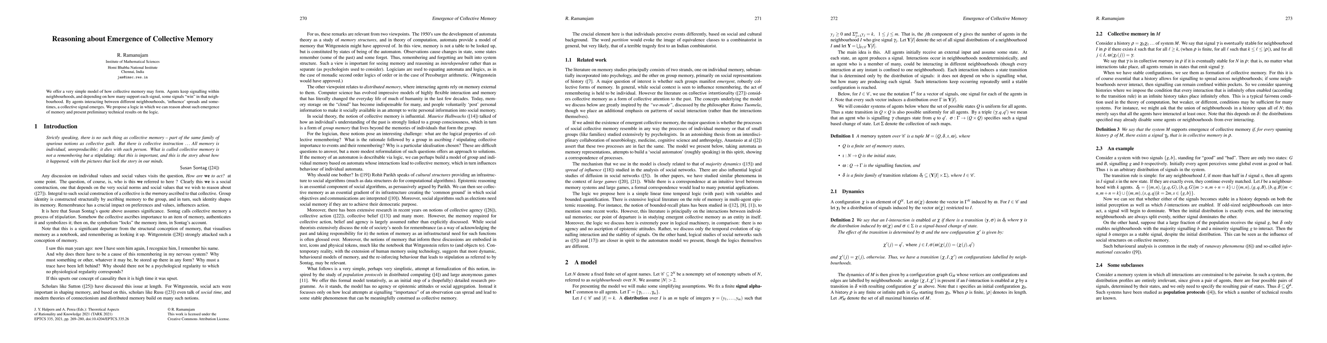 This paper proposes a simple model for the formation of collective memory through local interactions and signal support among agents, and introduces a logic to reason about the emergence of collective signals across different neighborhoods. Preliminary technical results on this logic are presented.