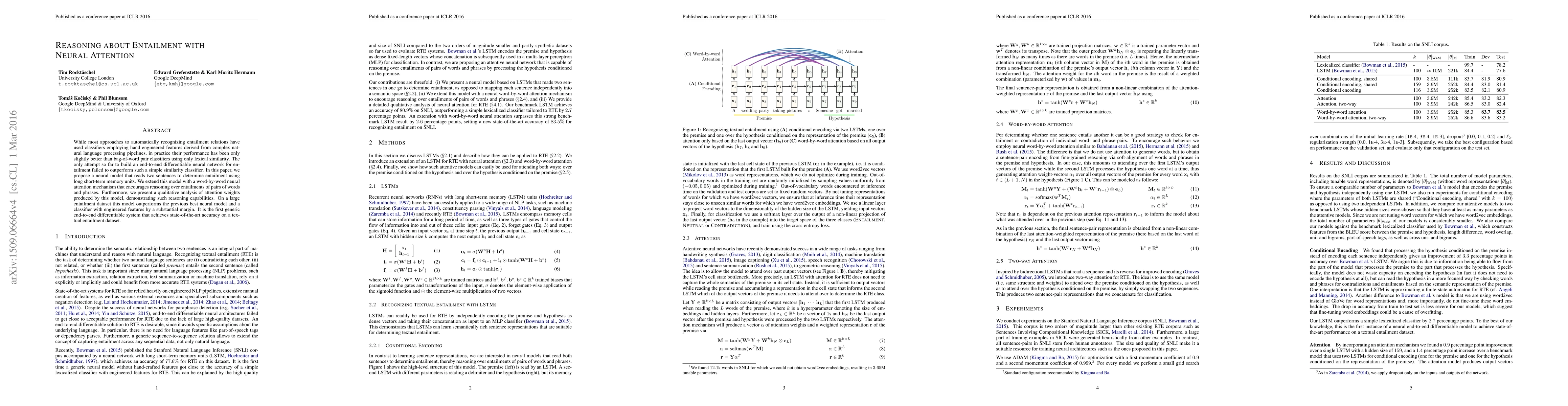 This paper proposes a neural model using LSTM units and a word-by-word attention mechanism to determine textual entailment, outperforming previous models and classifiers. The attention mechanism enhances reasoning over word and phrase pairs, achieving state-of-the-art accuracy on a large entailment dataset.