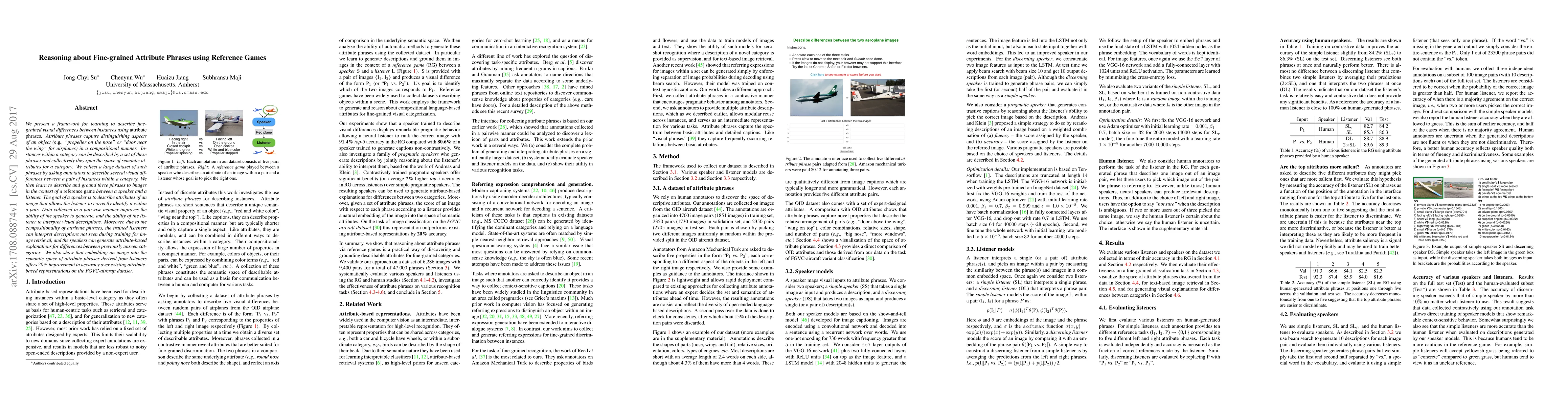 We present a framework for learning to describe fine-grained visual differences between instances using attribute phrases. Attribute phrases capture distinguishing aspects of an object (e.g., "propeller on the nose" or "door near the wing" for airplanes) in a compositional manner. Instances within a category can be described by a set of these phrases and collectively they span the space of semantic attributes for a category. We collect a large dataset of such phrases by asking annotators to describe several visual differences between a pair of instances within a category. We then learn to describe and ground these phrases to images in the context of a *reference game* between a speaker and a listener. The goal of a speaker is to describe attributes of an image that allows the listener to correctly identify it within a pair. Data collected in a pairwise manner improves the ability of the speaker to generate, and the ability of the listener to interpret visual descriptions. Moreover, due to the compositionality of attribute phrases, the trained listeners can interpret descriptions not seen during training for image retrieval, and the speakers can generate attribute-based explanations for differences between previously unseen categories. We also show that embedding an image into the semantic space of attribute phrases derived from listeners offers 20% improvement in accuracy over existing attribute-based representations on the FGVC-aircraft dataset.