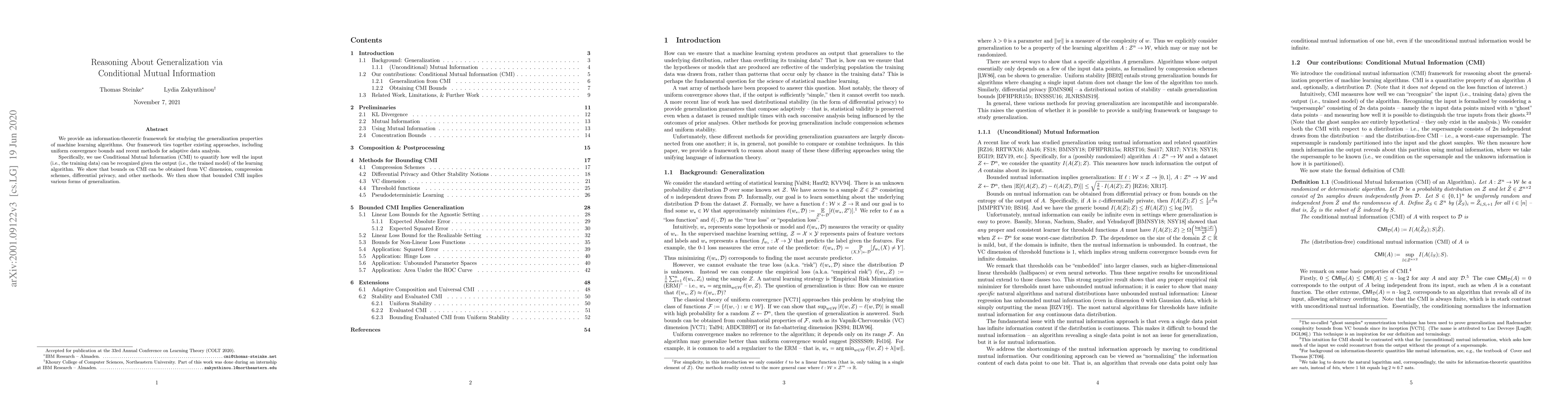 We provide an information-theoretic framework for studying the generalization properties of machine learning algorithms. Our framework ties together existing approaches, including uniform convergence bounds and recent methods for adaptive data analysis. Specifically, we use Conditional Mutual Information (CMI) to quantify how well the input (i.e., the training data) can be recognized given the output (i.e., the trained model) of the learning algorithm. We show that bounds on CMI can be obtained from VC dimension, compression schemes, differential privacy, and other methods. We then show that bounded CMI implies various forms of generalization.