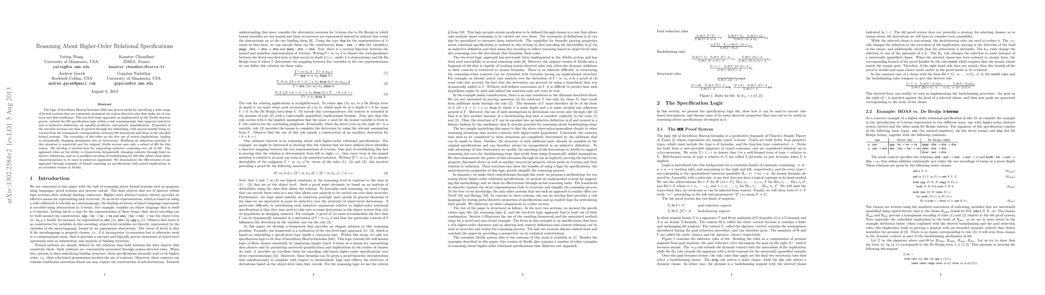 The logic of hereditary Harrop formulas (HH) has proven useful for specifying a wide range of formal systems. This logic includes a form of hypothetical judgment that leads to dynamically changing sets of assumptions and that is key to encoding side conditions and contexts that occur frequently in structural operational semantics (SOS) style presentations. Specifications are often useful in reasoning about the systems they describe. The Abella theorem prover supports such reasoning by explicitly embedding the specification logic within a rich reasoning logic; specifications are then reasoned about through this embedding. However, realizing an induction principle in the face of dynamically changing assumption sets is nontrivial and the original Abella system uses only a subset of the HH specification logic for this reason. We develop a method here for supporting inductive reasoning over all of HH. Our approach takes advantage of a focusing property of HH to isolate the use of an assumption and the ability to finitely characterize the structure of any such assumption in the reasoning logic. We demonstrate the effectiveness of these ideas via several specification and meta-theoretic reasoning examples that have been implemented in an extended version of Abella.
