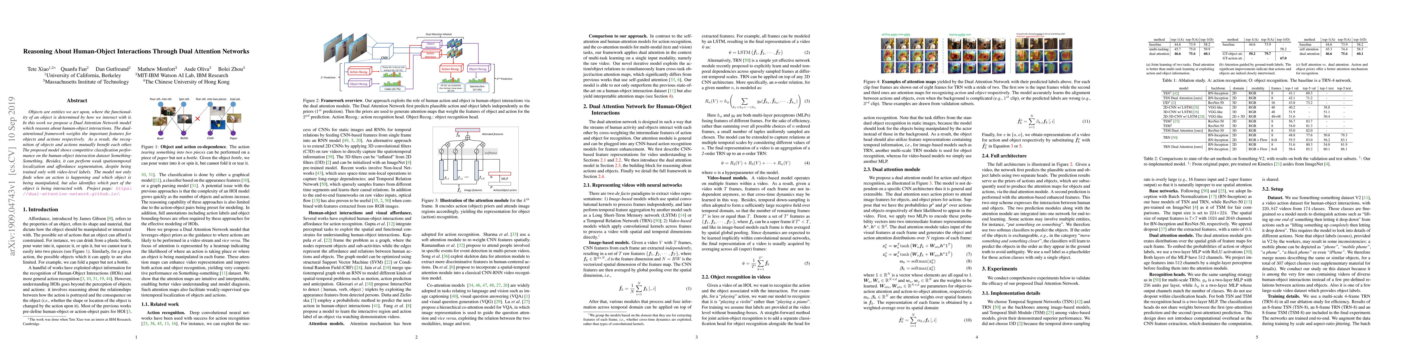 Objects are entities we act upon, where the functionality of an object is determined by how we interact with it. In this work we propose a Dual Attention Network model which reasons about human-object interactions. The dual-attentional framework weights the important features for objects and actions respectively. As a result, the recognition of objects and actions mutually benefit each other. The proposed model shows competitive classification performance on the human-object interaction dataset Something-Something. Besides, it can perform weak spatiotemporal localization and affordance segmentation, despite being trained only with video-level labels. The model not only finds when an action is happening and which object is being manipulated, but also identifies which part of the object is being interacted with. Project page: \url{https://dual-attention-network.github.io/}.