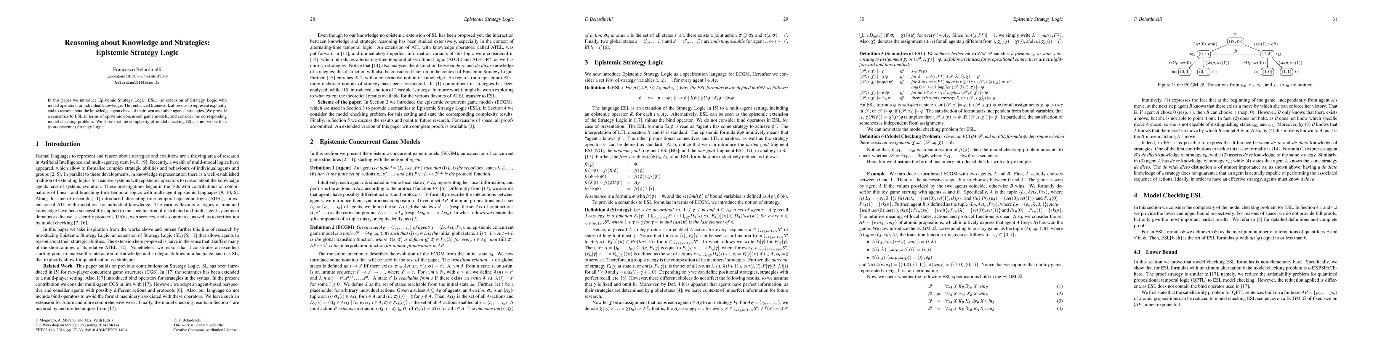 This paper introduces Epistemic Strategy Logic (ESL), extending Strategy Logic with modal operators to explicitly represent and reason about agents' knowledge of their own and others' strategies. The authors provide a semantics for ESL using epistemic concurrent game models and demonstrate that ESL's model checking complexity is comparable to that of non-epistemic Strategy Logic.