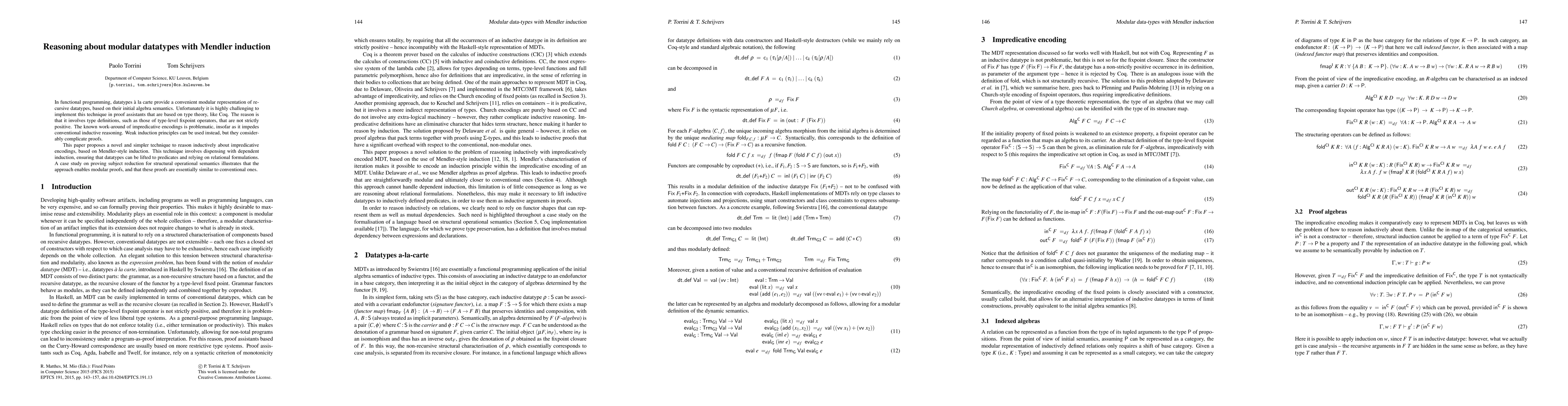 In functional programming, datatypes a la carte provide a convenient modular representation of recursive datatypes, based on their initial algebra semantics. Unfortunately it is highly challenging to implement this technique in proof assistants that are based on type theory, like Coq. The reason is that it involves type definitions, such as those of type-level fixpoint operators, that are not strictly positive. The known work-around of impredicative encodings is problematic, insofar as it impedes conventional inductive reasoning. Weak induction principles can be used instead, but they considerably complicate proofs. This paper proposes a novel and simpler technique to reason inductively about impredicative encodings, based on Mendler-style induction. This technique involves dispensing with dependent induction, ensuring that datatypes can be lifted to predicates and relying on relational formulations. A case study on proving subject reduction for structural operational semantics illustrates that the approach enables modular proofs, and that these proofs are essentially similar to conventional ones.