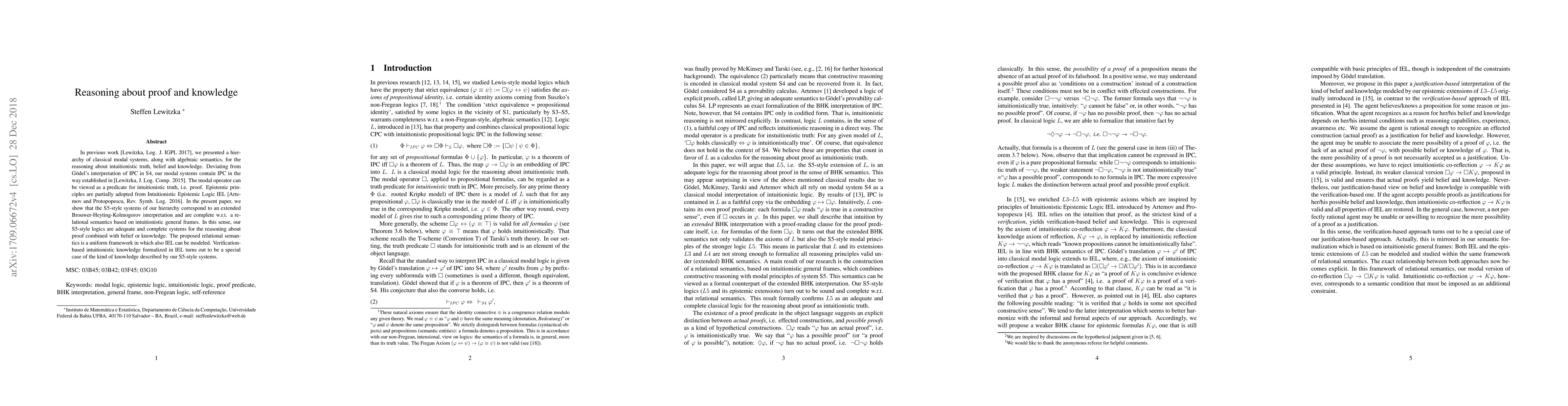In previous work [Lewitzka, Log. J. IGPL 2017], we presented a hierarchy of classical modal systems, along with algebraic semantics, for the reasoning about intuitionistic truth, belief and knowledge. Deviating from G\"odel's interpretation of IPC in S4, our modal systems contain IPC in the way established in [Lewitzka, J. Log. Comp. 2015]. The modal operator can be viewed as a predicate for intuitionistic truth, i.e. proof. Epistemic principles are partially adopted from Intuitionistic Epistemic Logic IEL [Artemov and Protopopescu, Rev. Symb. Log. 2016]. In the present paper, we show that the S5-style systems of our hierarchy correspond to an extended Brouwer-Heyting-Kolmogorov interpretation and are complete w.r.t. a relational semantics based on intuitionistic general frames. In this sense, our S5-style logics are adequate and complete systems for the reasoning about proof combined with belief or knowledge. The proposed relational semantics is a uniform framework in which also IEL can be modeled. Verification-based intuitionistic knowledge formalized in IEL turns out to be a special case of the kind of knowledge described by our S5-style systems.