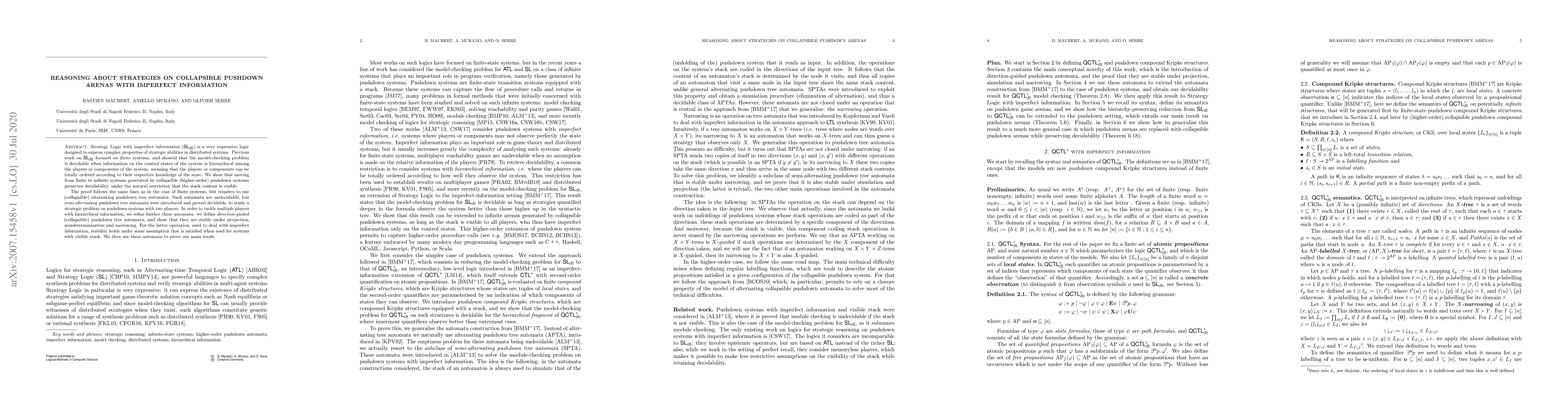 This paper extends the decidability of Strategy Logic with imperfect information (SLiR) to infinite systems modeled by collapsible pushdown arenas, where stack content is visible. It introduces direction-guided (collapsible) pushdown tree automata to handle multiple players with hierarchical information, proving their stability under various operations.