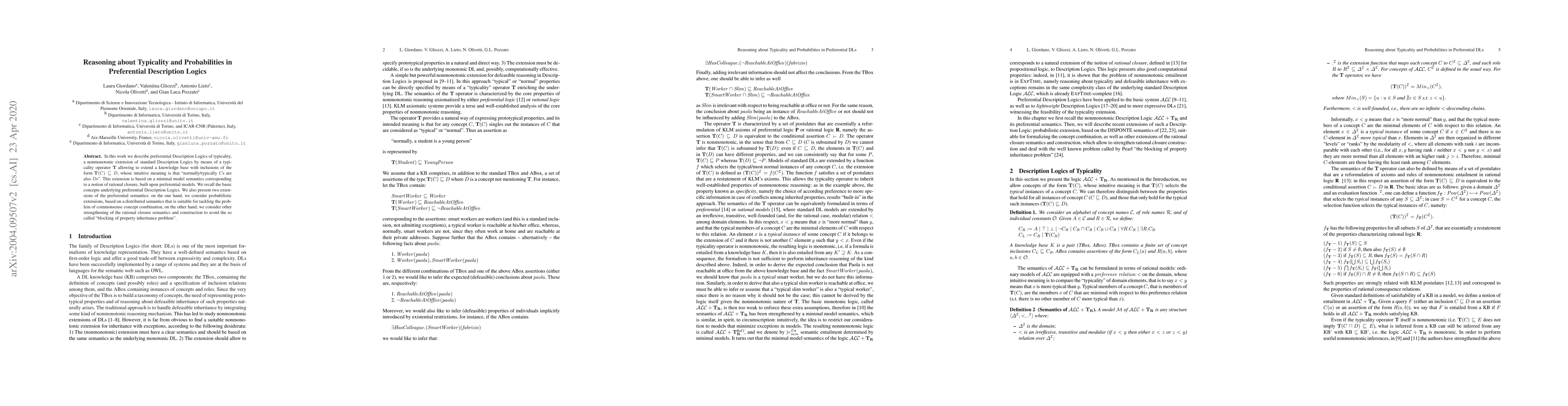 This paper introduces preferential Description Logics with a typicality operator T for nonmonotonic reasoning, enabling inclusions like T(C) v D, meaning typically Cs are Ds. It explores probabilistic extensions and improvements to avoid property inheritance issues.