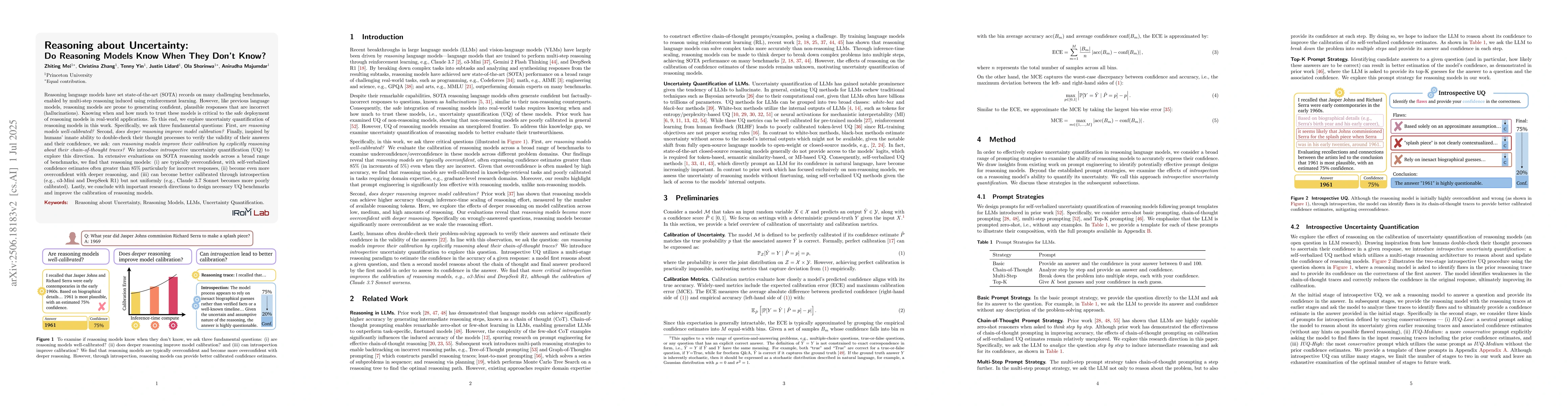 Reasoning language models have set state-of-the-art (SOTA) records on many challenging benchmarks, enabled by multi-step reasoning induced using reinforcement learning. However, like previous language models, reasoning models are prone to generating confident, plausible responses that are incorrect (hallucinations). Knowing when and how much to trust these models is critical to the safe deployment of reasoning models in real-world applications. To this end, we explore uncertainty quantification of reasoning models in this work. Specifically, we ask three fundamental questions: First, are reasoning models well-calibrated? Second, does deeper reasoning improve model calibration? Finally, inspired by humans' innate ability to double-check their thought processes to verify the validity of their answers and their confidence, we ask: can reasoning models improve their calibration by explicitly reasoning about their chain-of-thought traces? We introduce introspective uncertainty quantification (UQ) to explore this direction. In extensive evaluations on SOTA reasoning models across a broad range of benchmarks, we find that reasoning models: (i) are typically overconfident, with self-verbalized confidence estimates often greater than 85% particularly for incorrect responses, (ii) become even more overconfident with deeper reasoning, and (iii) can become better calibrated through introspection (e.g., o3-Mini and DeepSeek R1) but not uniformly (e.g., Claude 3.7 Sonnet becomes more poorly calibrated). Lastly, we conclude with important research directions to design necessary UQ benchmarks and improve the calibration of reasoning models.