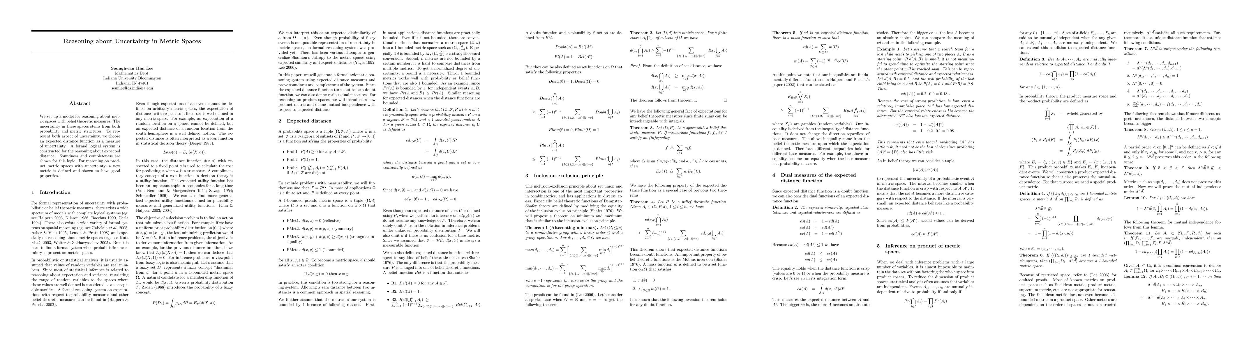 This paper develops a model for reasoning about uncertainty in metric spaces using belief theoretic measures, employing an expected distance function to capture both probabilistic and metric uncertainty. It constructs a formal logical system for reasoning about expected distance, proving its soundness and completeness.