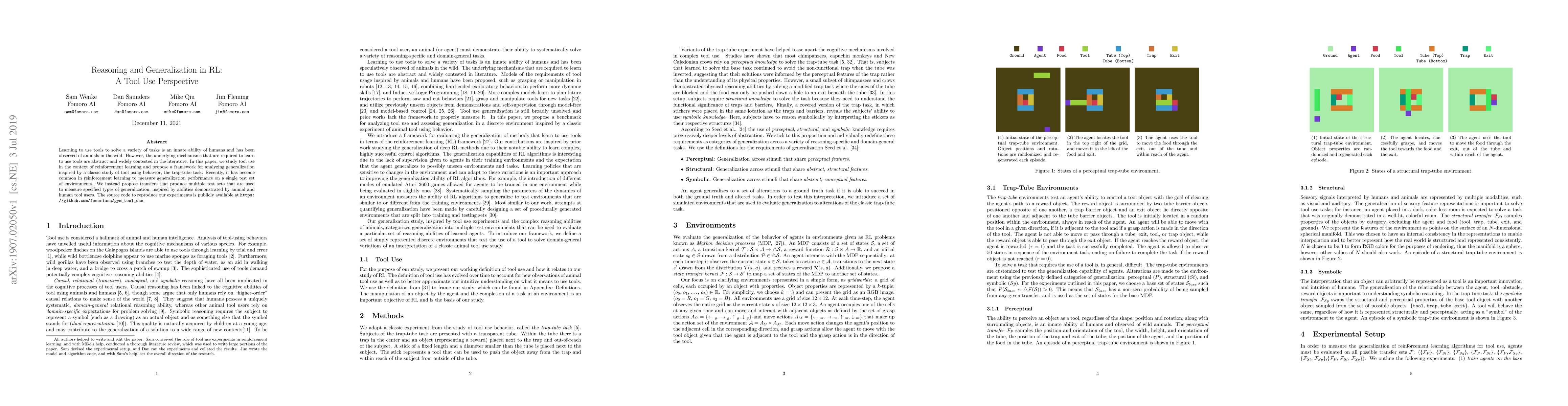 Learning to use tools to solve a variety of tasks is an innate ability of humans and has been observed of animals in the wild. However, the underlying mechanisms that are required to learn to use tools are abstract and widely contested in the literature. In this paper, we study tool use in the context of reinforcement learning and propose a framework for analyzing generalization inspired by a classic study of tool using behavior, the trap-tube task. Recently, it has become common in reinforcement learning to measure generalization performance on a single test set of environments. We instead propose transfers that produce multiple test sets that are used to measure specified types of generalization, inspired by abilities demonstrated by animal and human tool users. The source code to reproduce our experiments is publicly available at https://github.com/fomorians/gym_tool_use.