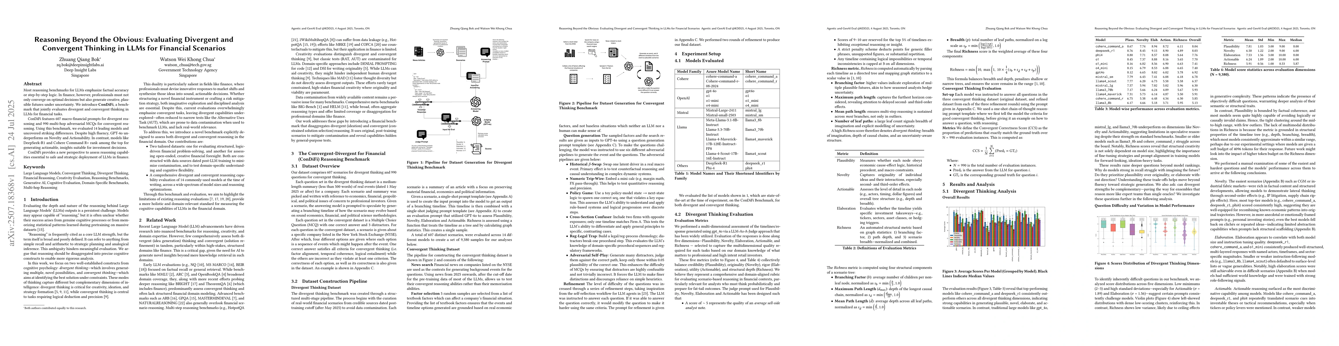 Most reasoning benchmarks for LLMs emphasize factual accuracy or step-by-step logic. In finance, however, professionals must not only converge on optimal decisions but also generate creative, plausible futures under uncertainty. We introduce ConDiFi, a benchmark that jointly evaluates divergent and convergent thinking in LLMs for financial tasks. ConDiFi features 607 macro-financial prompts for divergent reasoning and 990 multi-hop adversarial MCQs for convergent reasoning. Using this benchmark, we evaluated 14 leading models and uncovered striking differences. Despite high fluency, GPT-4o underperforms on Novelty and Actionability. In contrast, models like DeepSeek-R1 and Cohere Command R+ rank among the top for generating actionable, insights suitable for investment decisions. ConDiFi provides a new perspective to assess reasoning capabilities essential to safe and strategic deployment of LLMs in finance.