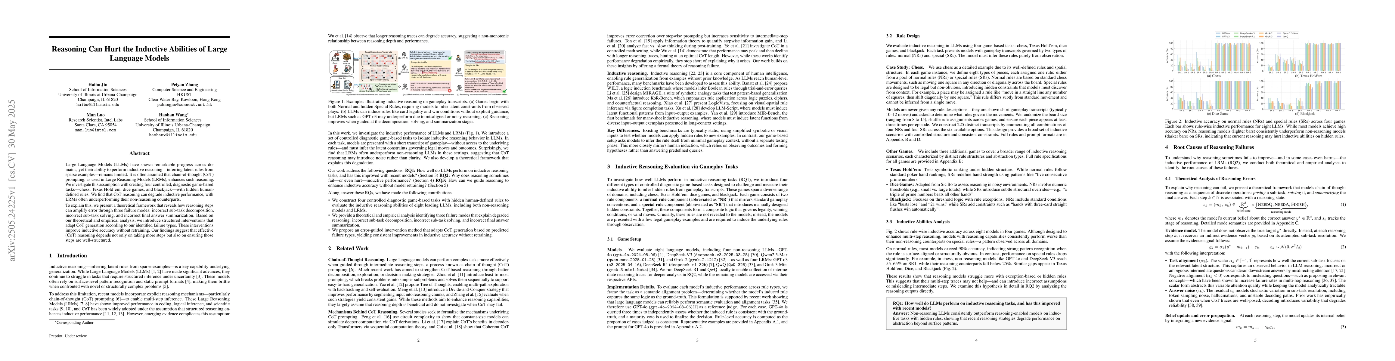 Large Language Models (LLMs) have shown remarkable progress across domains, yet their ability to perform inductive reasoning - inferring latent rules from sparse examples - remains limited. It is often assumed that chain-of-thought (CoT) prompting, as used in Large Reasoning Models (LRMs), enhances such reasoning. We investigate this assumption with creating four controlled, diagnostic game-based tasks - chess, Texas Hold'em, dice games, and blackjack - with hidden human-defined rules. We find that CoT reasoning can degrade inductive performance, with LRMs often underperforming their non-reasoning counterparts. To explain this, we present a theoretical framework that reveals how reasoning steps can amplify error through three failure modes: incorrect sub-task decomposition, incorrect sub-task solving, and incorrect final answer summarization. Based on our theoretical and empirical analysis, we introduce structured interventions that adapt CoT generation according to our identified failure types. These interventions improve inductive accuracy without retraining. Our findings suggest that effective (CoT) reasoning depends not only on taking more steps but also on ensuring those steps are well-structured.