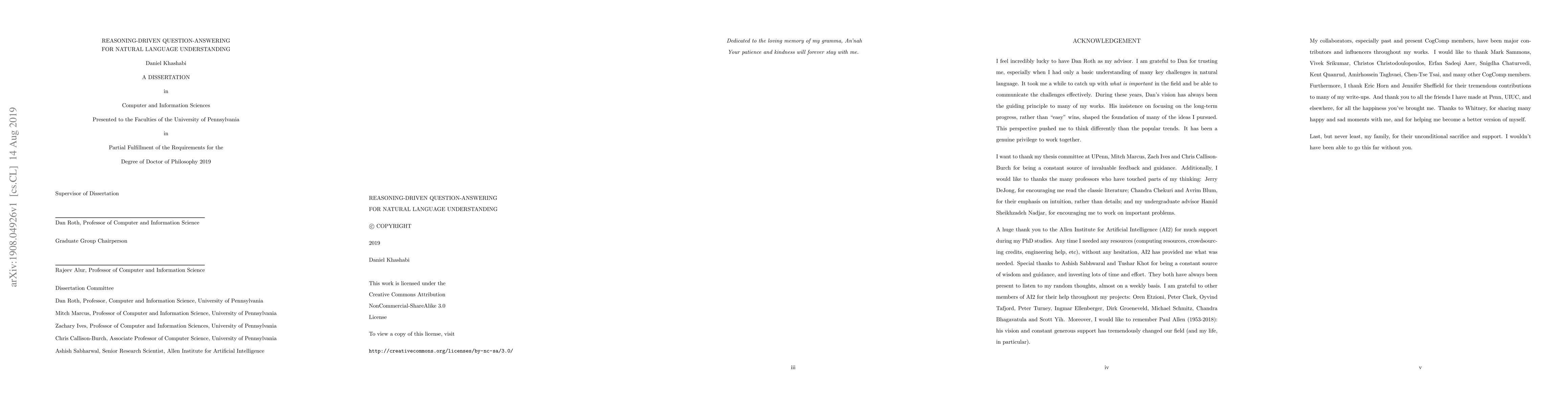Natural language understanding (NLU) of text is a fundamental challenge in AI, and it has received significant attention throughout the history of NLP research. This primary goal has been studied under different tasks, such as Question Answering (QA) and Textual Entailment (TE). In this thesis, we investigate the NLU problem through the QA task and focus on the aspects that make it a challenge for the current state-of-the-art technology. This thesis is organized into three main parts: In the first part, we explore multiple formalisms to improve existing machine comprehension systems. We propose a formulation for abductive reasoning in natural language and show its effectiveness, especially in domains with limited training data. Additionally, to help reasoning systems cope with irrelevant or redundant information, we create a supervised approach to learn and detect the essential terms in questions. In the second part, we propose two new challenge datasets. In particular, we create two datasets of natural language questions where (i) the first one requires reasoning over multiple sentences; (ii) the second one requires temporal common sense reasoning. We hope that the two proposed datasets will motivate the field to address more complex problems. In the final part, we present the first formal framework for multi-step reasoning algorithms, in the presence of a few important properties of language use, such as incompleteness, ambiguity, etc. We apply this framework to prove fundamental limitations for reasoning algorithms. These theoretical results provide extra intuition into the existing empirical evidence in the field.