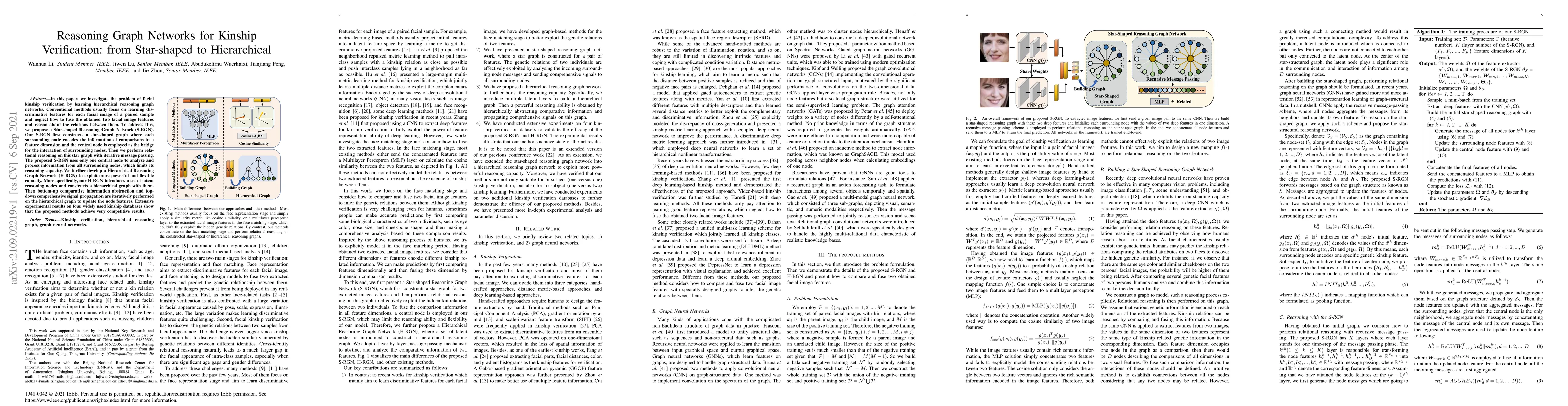 This paper proposes Star-shaped and Hierarchical Reasoning Graph Networks (S-RGN and H-RGN) for facial kinship verification, addressing the limitation of conventional methods that fail to fuse facial features and reason about their relations. The H-RGN introduces latent reasoning nodes in a hierarchical graph to achieve better comparative information abstraction and signal propagation. Experimental results demonstrate competitive performance on kinship verification tasks.
