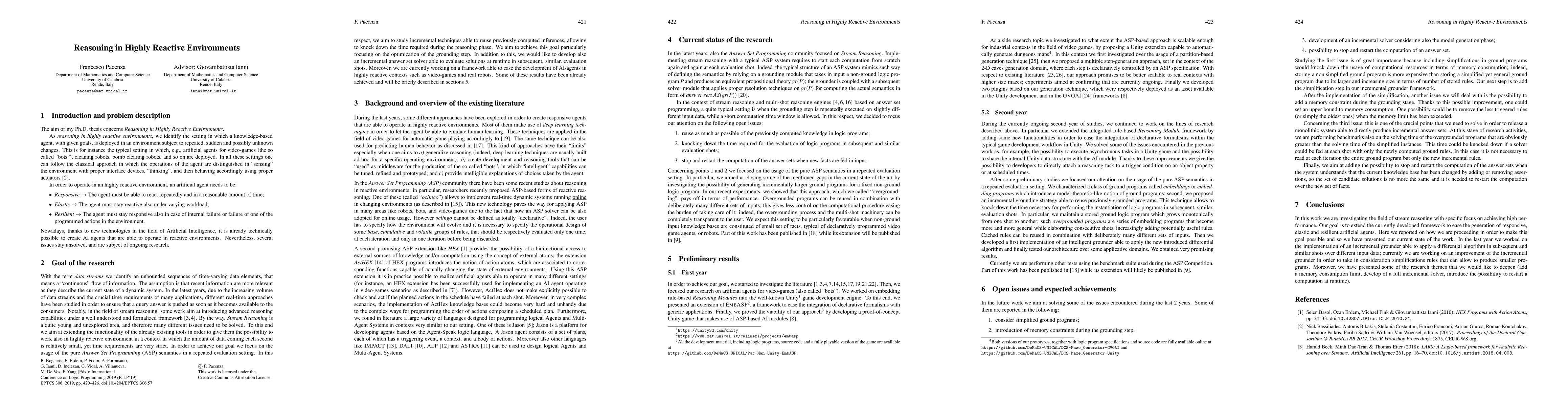 The aim of my Ph.D. thesis concerns Reasoning in Highly Reactive Environments. As reasoning in highly reactive environments, we identify the setting in which a knowledge-based agent, with given goals, is deployed in an environment subject to repeated, sudden and possibly unknown changes. This is for instance the typical setting in which, e.g., artificial agents for video-games (the so called "bots"), cleaning robots, bomb clearing robots, and so on are deployed. In all these settings one can follow the classical approach in which the operations of the agent are distinguished in "sensing" the environment with proper interface devices, "thinking", and then behaving accordingly using proper actuators. In order to operate in an highly reactive environment, an artificial agent needs to be: 1. Responsive -> The agent must be able to react repeatedly and in a reasonable amount of time; 2. Elastic -> The agent must stay reactive also under varying workload; 3. Resilient -> The agent must stay responsive also in case of internal failure or failure of one of the programmed actions in the environment. Nowadays, thanks to new technologies in the field of Artificial Intelligence, it is already technically possible to create AI agents that are able to operate in reactive environments. Nevertheless, several issues stay unsolved, and are subject of ongoing research.