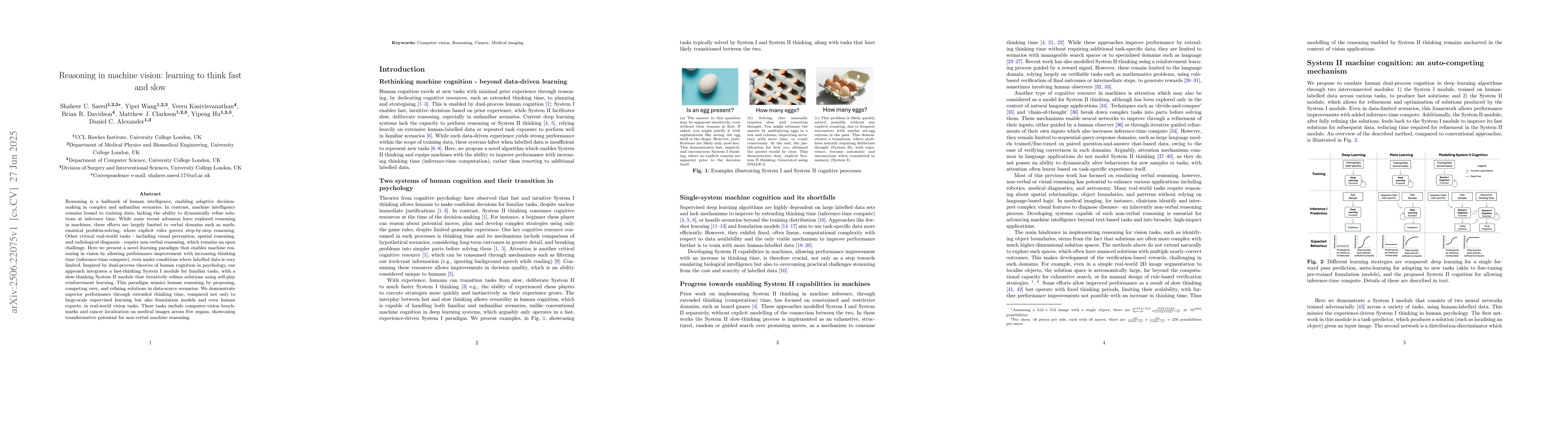 Reasoning is a hallmark of human intelligence, enabling adaptive decision-making in complex and unfamiliar scenarios. In contrast, machine intelligence remains bound to training data, lacking the ability to dynamically refine solutions at inference time. While some recent advances have explored reasoning in machines, these efforts are largely limited to verbal domains such as mathematical problem-solving, where explicit rules govern step-by-step reasoning. Other critical real-world tasks - including visual perception, spatial reasoning, and radiological diagnosis - require non-verbal reasoning, which remains an open challenge. Here we present a novel learning paradigm that enables machine reasoning in vision by allowing performance improvement with increasing thinking time (inference-time compute), even under conditions where labelled data is very limited. Inspired by dual-process theories of human cognition in psychology, our approach integrates a fast-thinking System I module for familiar tasks, with a slow-thinking System II module that iteratively refines solutions using self-play reinforcement learning. This paradigm mimics human reasoning by proposing, competing over, and refining solutions in data-scarce scenarios. We demonstrate superior performance through extended thinking time, compared not only to large-scale supervised learning but also foundation models and even human experts, in real-world vision tasks. These tasks include computer-vision benchmarks and cancer localisation on medical images across five organs, showcasing transformative potential for non-verbal machine reasoning.