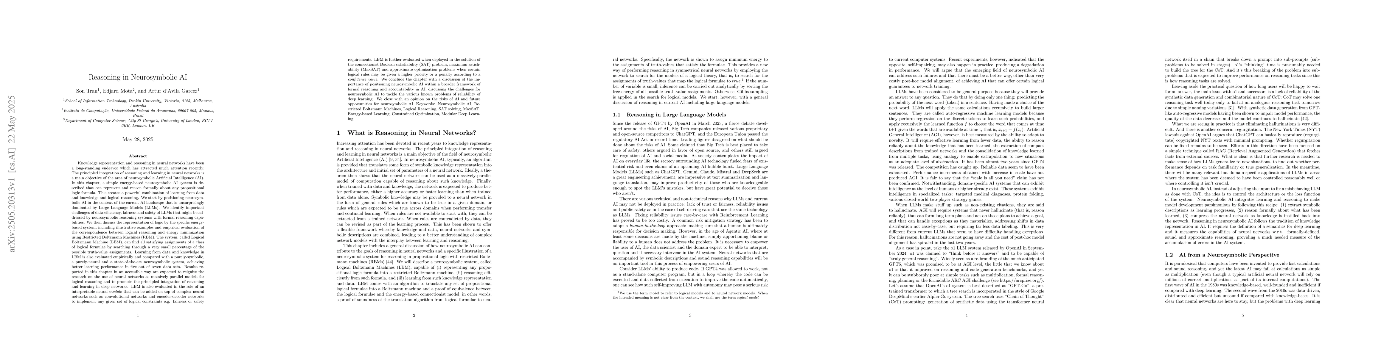 Knowledge representation and reasoning in neural networks have been a long-standing endeavor which has attracted much attention recently. The principled integration of reasoning and learning in neural networks is a main objective of the area of neurosymbolic Artificial Intelligence (AI). In this chapter, a simple energy-based neurosymbolic AI system is described that can represent and reason formally about any propositional logic formula. This creates a powerful combination of learning from data and knowledge and logical reasoning. We start by positioning neurosymbolic AI in the context of the current AI landscape that is unsurprisingly dominated by Large Language Models (LLMs). We identify important challenges of data efficiency, fairness and safety of LLMs that might be addressed by neurosymbolic reasoning systems with formal reasoning capabilities. We then discuss the representation of logic by the specific energy-based system, including illustrative examples and empirical evaluation of the correspondence between logical reasoning and energy minimization using Restricted Boltzmann Machines (RBM). Learning from data and knowledge is also evaluated empirically and compared with a symbolic, neural and a neurosymbolic system. Results reported in this chapter in an accessible way are expected to reignite the research on the use of neural networks as massively-parallel models for logical reasoning and promote the principled integration of reasoning and learning in deep networks. We conclude the chapter with a discussion of the importance of positioning neurosymbolic AI within a broader framework of formal reasoning and accountability in AI, discussing the challenges for neurosynbolic AI to tackle the various known problems of reliability of deep learning.
