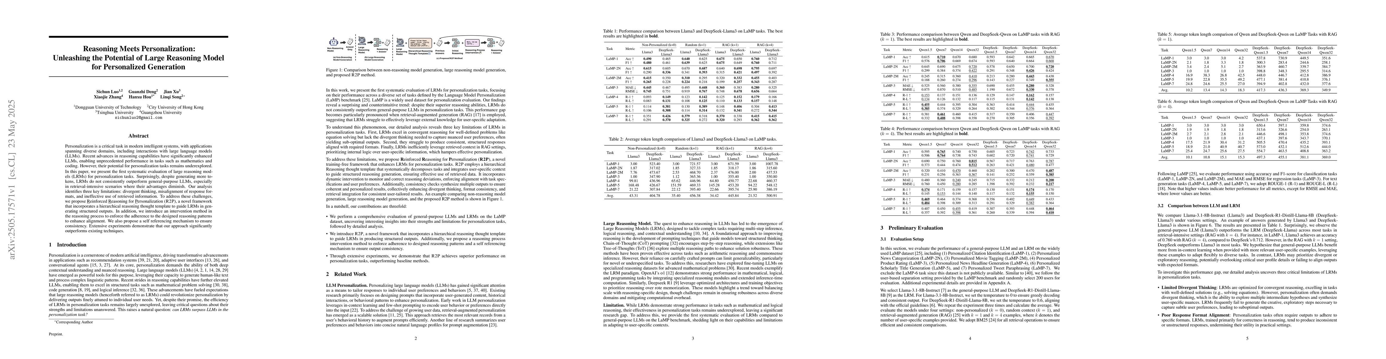 This work is novel as it is the first systematic evaluation of LRMs for personalization tasks and proposes a new framework, \model, to address the identified limitations, significantly outperforming existing techniques.