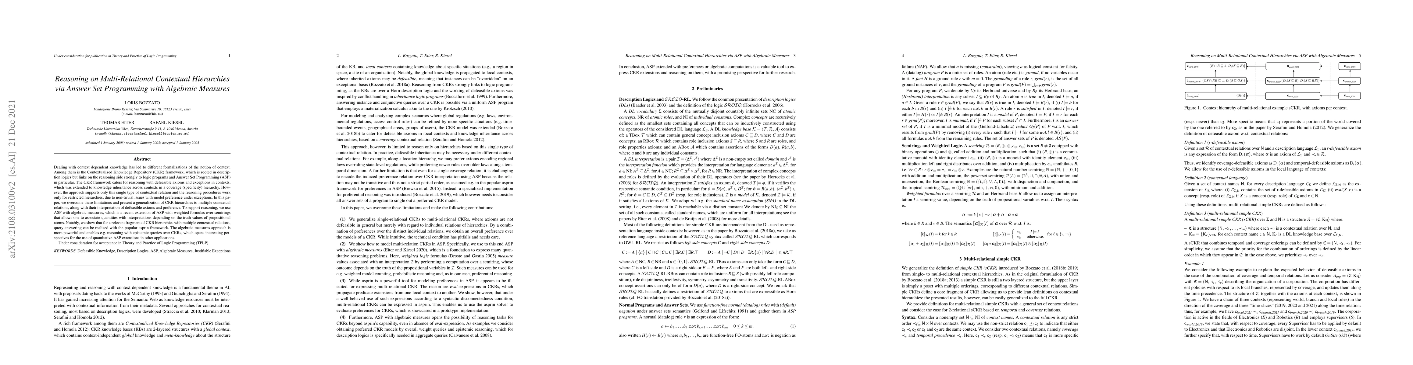 This paper generalizes the Contextualized Knowledge Repository (CKR) framework to handle multiple contextual relations, extending beyond single-type contextual hierarchies. It leverages Answer Set Programming (ASP) with algebraic measures to reason about defeasible axioms and exceptions across these hierarchies, enabling more complex reasoning and query answering, including epistemic queries.