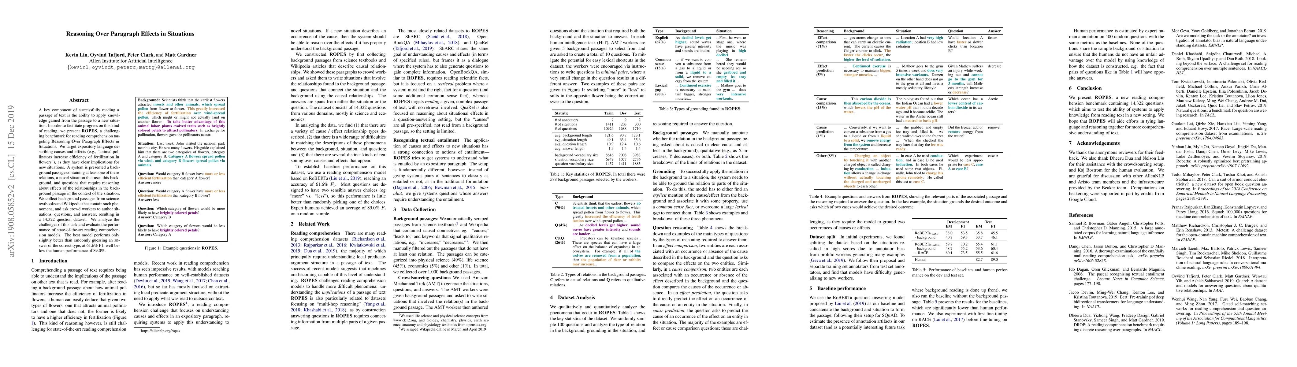 The paper introduces ROPES, a benchmark for reading comprehension focusing on reasoning over paragraph effects in situations, using expository language about causes and effects. Despite having 14,322 human-authored questions from science texts, state-of-the-art models only achieved 61.6% F1 score, significantly lower than human performance at 89.0%.