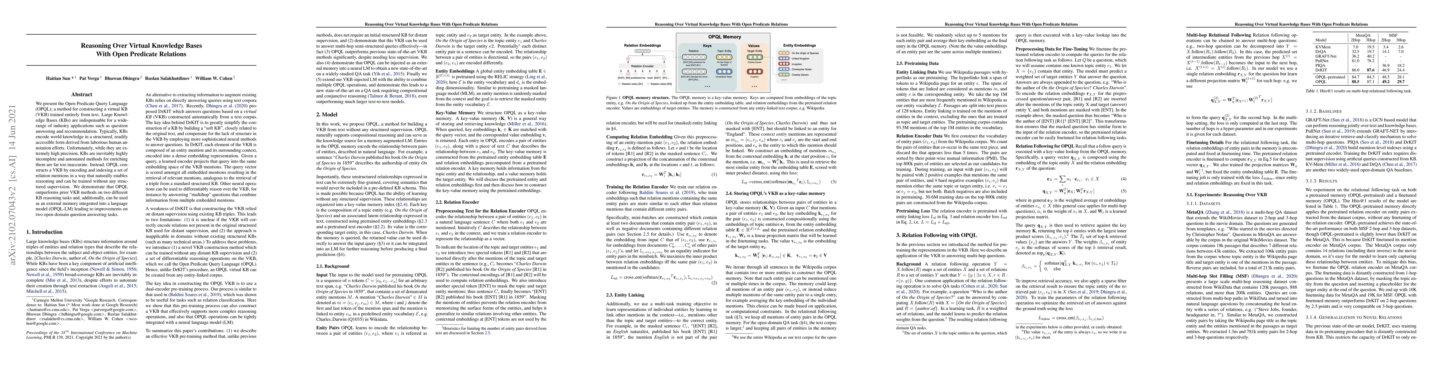 We present the Open Predicate Query Language (OPQL); a method for constructing a virtual KB (VKB) trained entirely from text. Large Knowledge Bases (KBs) are indispensable for a wide-range of industry applications such as question answering and recommendation. Typically, KBs encode world knowledge in a structured, readily accessible form derived from laborious human annotation efforts. Unfortunately, while they are extremely high precision, KBs are inevitably highly incomplete and automated methods for enriching them are far too inaccurate. Instead, OPQL constructs a VKB by encoding and indexing a set of relation mentions in a way that naturally enables reasoning and can be trained without any structured supervision. We demonstrate that OPQL outperforms prior VKB methods on two different KB reasoning tasks and, additionally, can be used as an external memory integrated into a language model (OPQL-LM) leading to improvements on two open-domain question answering tasks.