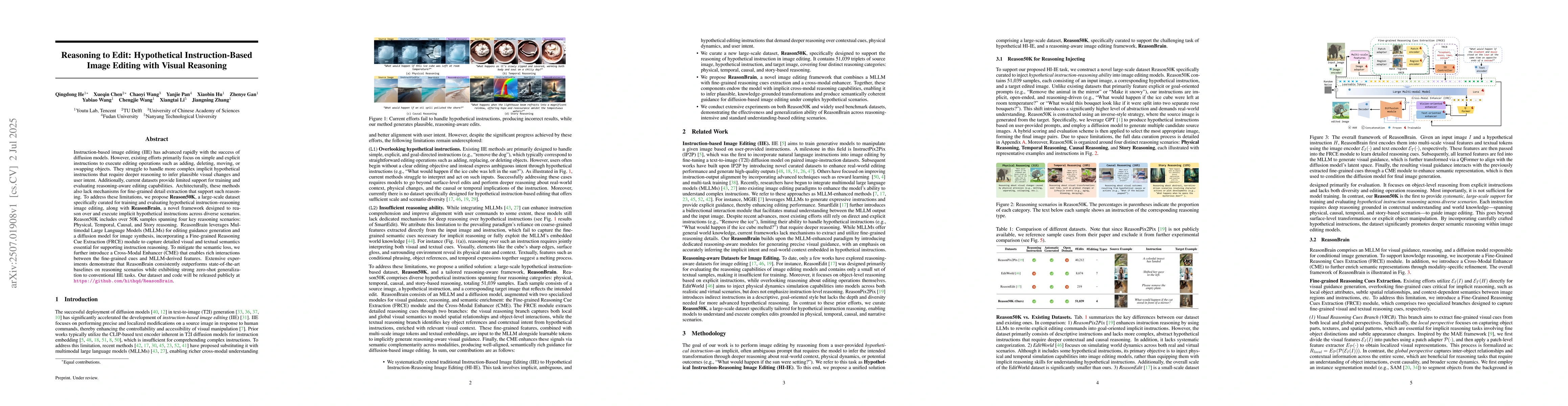 Instruction-based image editing (IIE) has advanced rapidly with the success of diffusion models. However, existing efforts primarily focus on simple and explicit instructions to execute editing operations such as adding, deleting, moving, or swapping objects. They struggle to handle more complex implicit hypothetical instructions that require deeper reasoning to infer plausible visual changes and user intent. Additionally, current datasets provide limited support for training and evaluating reasoning-aware editing capabilities. Architecturally, these methods also lack mechanisms for fine-grained detail extraction that support such reasoning. To address these limitations, we propose Reason50K, a large-scale dataset specifically curated for training and evaluating hypothetical instruction reasoning image editing, along with ReasonBrain, a novel framework designed to reason over and execute implicit hypothetical instructions across diverse scenarios. Reason50K includes over 50K samples spanning four key reasoning scenarios: Physical, Temporal, Causal, and Story reasoning. ReasonBrain leverages Multimodal Large Language Models (MLLMs) for editing guidance generation and a diffusion model for image synthesis, incorporating a Fine-grained Reasoning Cue Extraction (FRCE) module to capture detailed visual and textual semantics essential for supporting instruction reasoning. To mitigate the semantic loss, we further introduce a Cross-Modal Enhancer (CME) that enables rich interactions between the fine-grained cues and MLLM-derived features. Extensive experiments demonstrate that ReasonBrain consistently outperforms state-of-the-art baselines on reasoning scenarios while exhibiting strong zero-shot generalization to conventional IIE tasks. Our dataset and code will be released publicly.