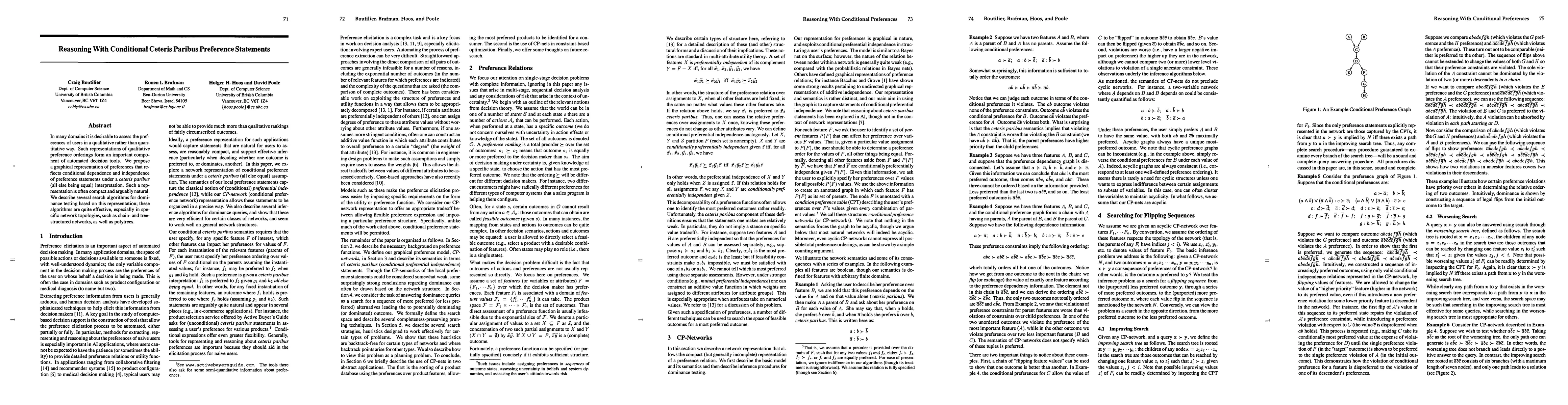 In many domains it is desirable to assess the preferences of users in a qualitative rather than quantitative way. Such representations of qualitative preference orderings form an importnat component of automated decision tools. We propose a graphical representation of preferences that reflects conditional dependence and independence of preference statements under a ceteris paribus (all else being equal) interpretation. Such a representation is ofetn compact and arguably natural. We describe several search algorithms for dominance testing based on this representation; these algorithms are quite effective, especially in specific network topologies, such as chain-and tree- structured networks, as well as polytrees.