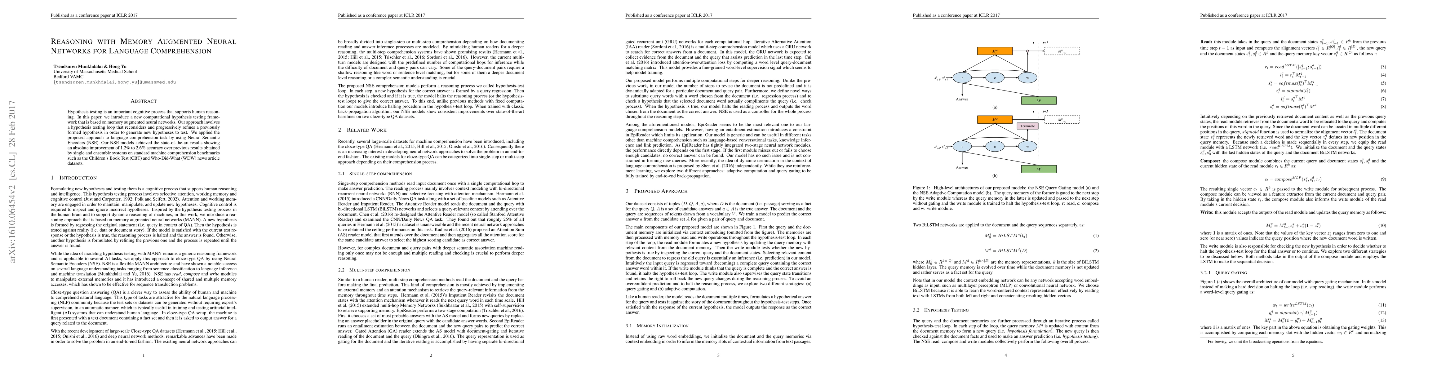 A new approach using memory augmented neural networks improves language comprehension accuracy by 1.2-2.6% on benchmark tests, achieving state-of-the-art results.