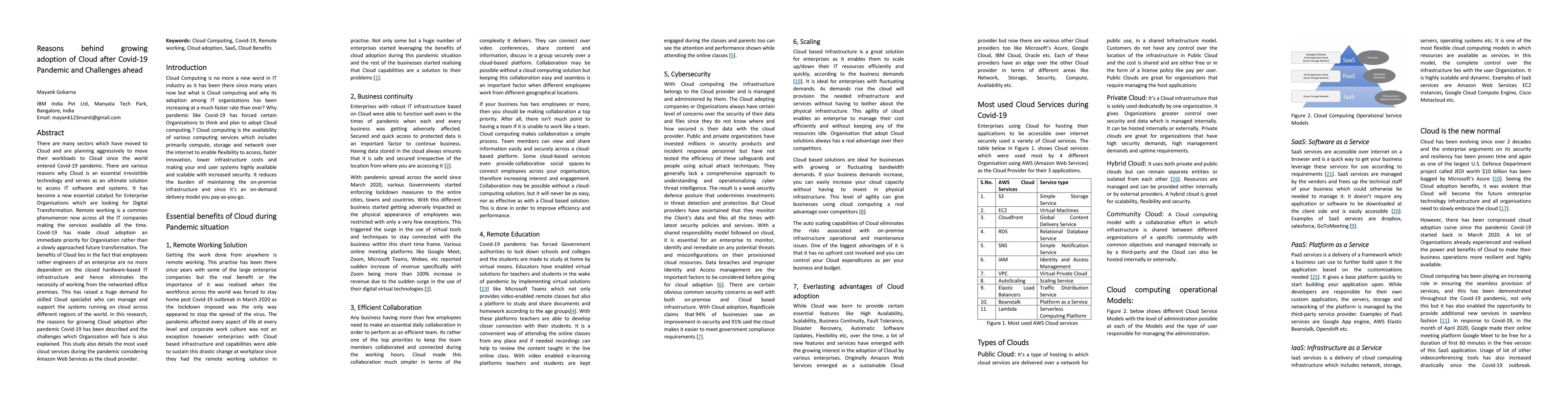 There are many sectors which have moved to Cloud and are planning aggressively to move their workloads to Cloud since the world entered Covid-19 pandemic. There are various reasons why Cloud is an essential irresistible technology and serves as an ultimate solution to access IT software and systems. It has become a new essential catalyst for Enterprise Organisations which are looking for Digital Transformation. Remote working is a common phenomenon now across all the IT companies making the services available all the time. Covid-19 has made cloud adoption an immediate priority for Organisation rather than a slowly approached future transformation. The benefits of Cloud lies in the fact that employees rather engineers of an enterprise are no more dependent on the closed hardware-based IT infrastructure and hence eliminates the necessity of working from the networked office premises. This has raised a huge demand for skilled Cloud specialist who can manage and support the systems running on cloud across different regions of the world. In this research, the reasons for growing Cloud adoption after pandemic Covid-19 has been described and the challenges which Organization will face is also explained. This study also details the most used cloud services during the pandemic considering Amazon Web Services as the cloud provider.