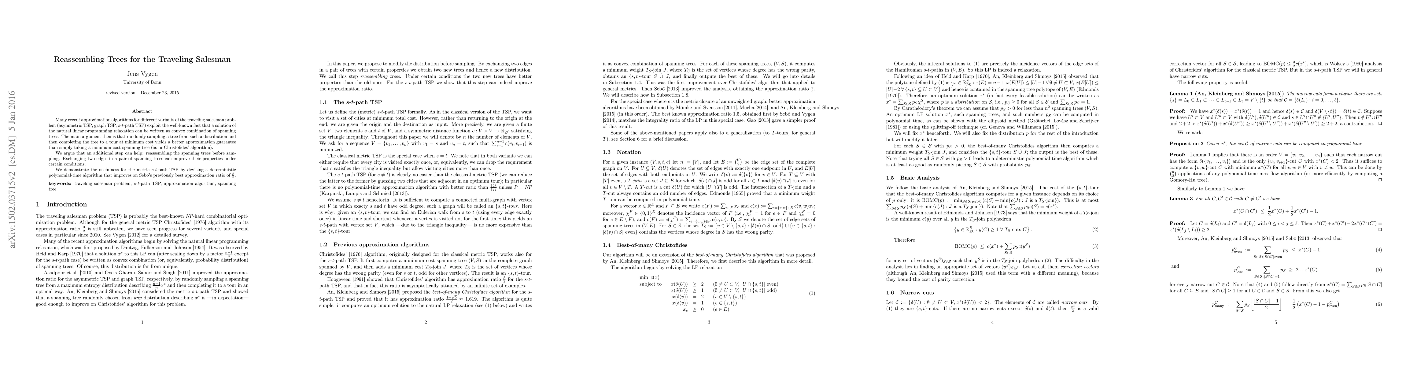 Many recent approximation algorithms for different variants of the traveling salesman problem (asymmetric TSP, graph TSP, s-t-path TSP) exploit the well-known fact that a solution of the natural linear programming relaxation can be written as convex combination of spanning trees. The main argument then is that randomly sampling a tree from such a distribution and then completing the tree to a tour at minimum cost yields a better approximation guarantee than simply taking a minimum cost spanning tree (as in Christofides' algorithm). We argue that an additional step can help: reassembling the spanning trees before sampling. Exchanging two edges in a pair of spanning trees can improve their properties under certain conditions. We demonstrate the usefulness for the metric s-t-path TSP by devising a deterministic polynomial-time algorithm that improves on Seb\H{o}'s previously best approximation ratio of 8/5.