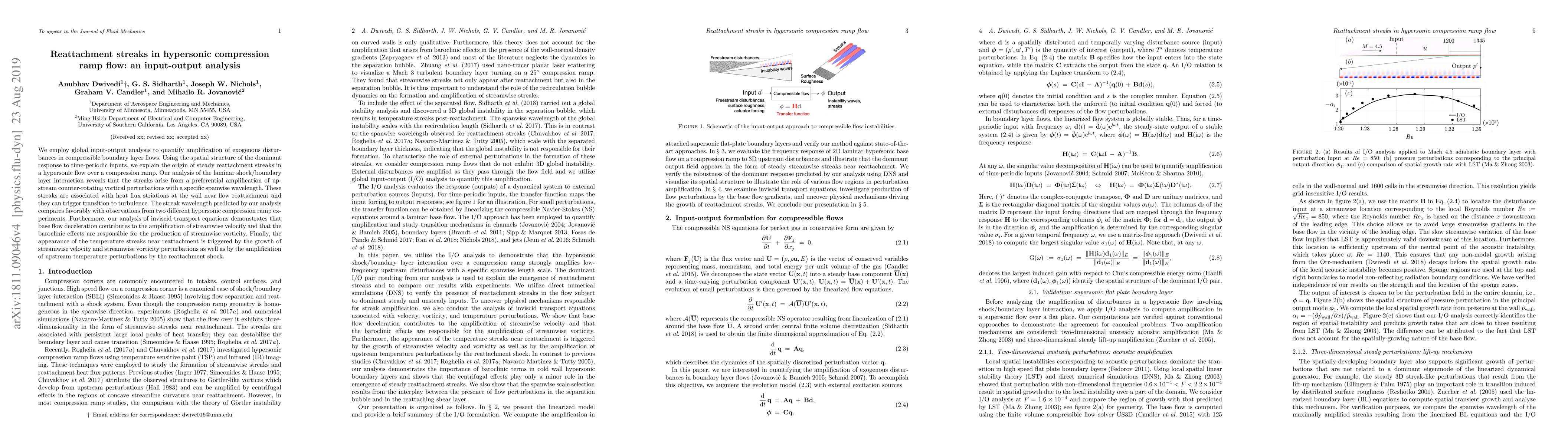 This paper uses global input-output analysis to explain the origin of steady reattachment streaks in hypersonic compression ramp flows, attributing them to amplified upstream counter-rotating vortical perturbations. The analysis links these streaks to heat flux striations and potential turbulence transition, with results corroborated by experimental observations.
