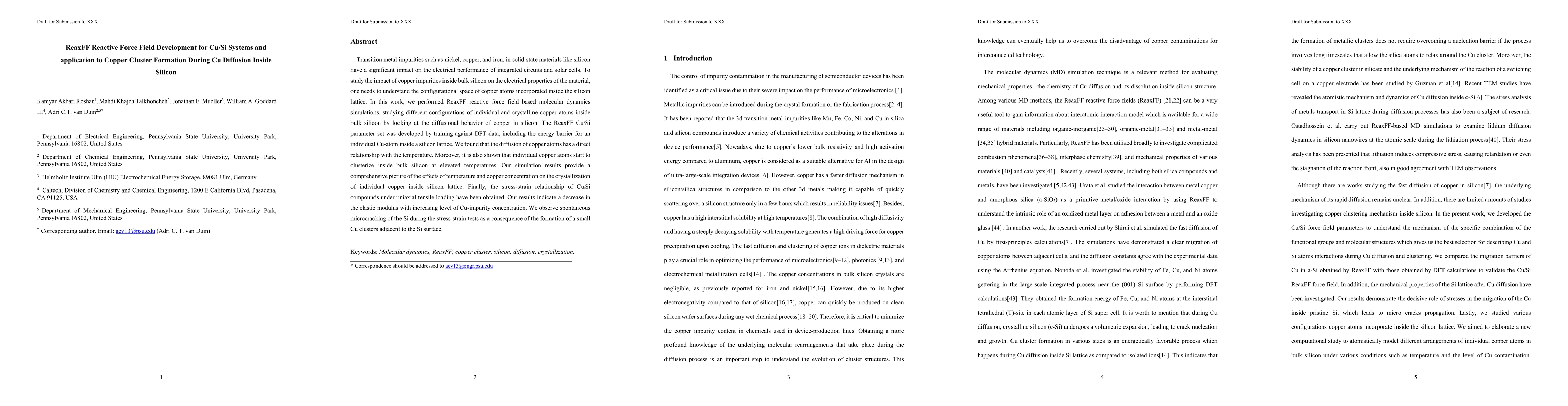 This paper develops a ReaxFF reactive force field for Cu/Si systems and uses it to simulate copper diffusion and clustering in silicon, revealing that copper atoms clusterize at elevated temperatures and that increased copper concentration lowers the elastic modulus, leading to microcracking in silicon under stress.