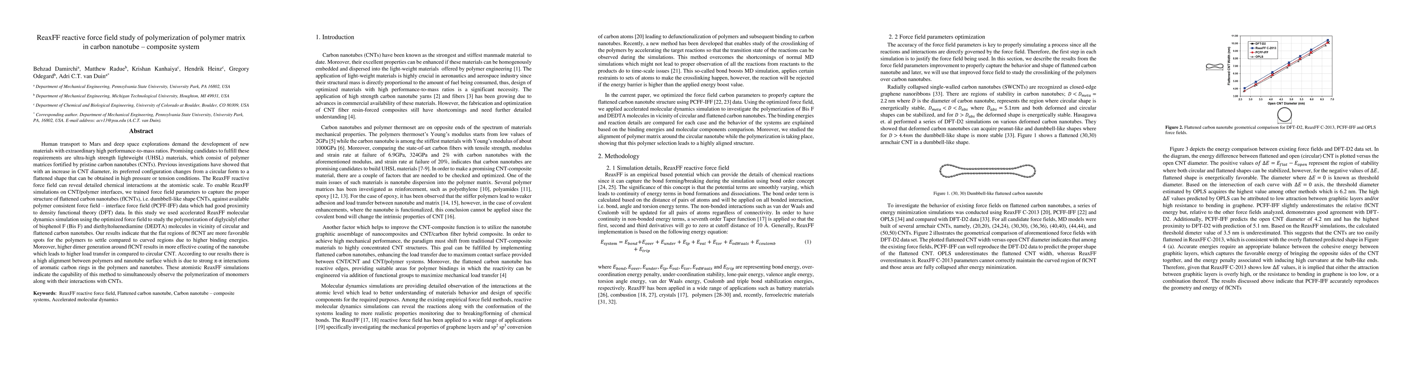This study uses ReaxFF reactive force field simulations to investigate the polymerization of Bis F and DEDTA in the presence of circular and flattened carbon nanotubes (flCNTs). Results show that flCNTs promote higher polymer binding and dimer generation, leading to better load transfer and strong pi-pi interactions, indicating the potential of ReaxFF for studying nanocomposite material interactions.
