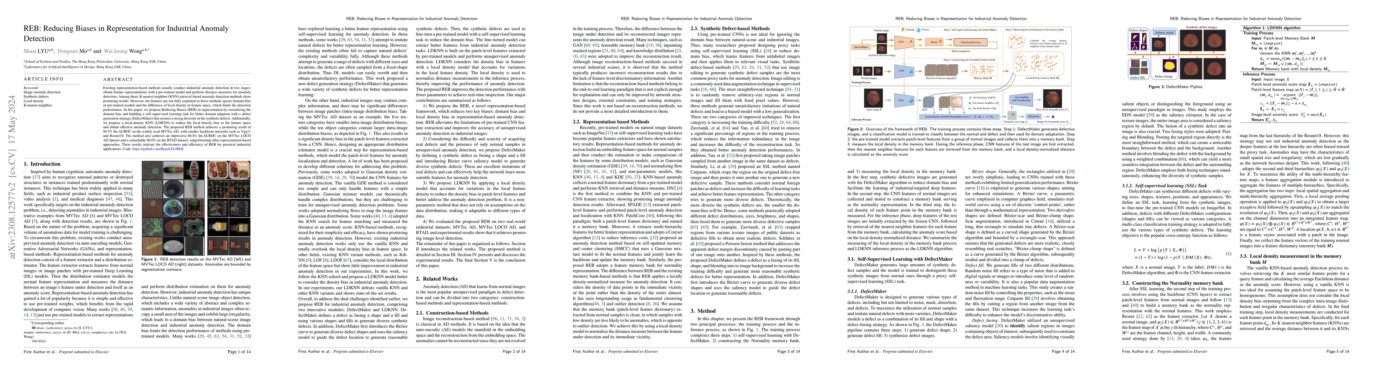 The paper proposes REB, a method to reduce biases in representation for industrial anomaly detection by addressing domain bias and local density bias. It introduces DefectMaker for synthetic defect generation and LDKNN for effective anomaly detection, achieving high AUROC scores on multiple datasets, demonstrating improved performance over other representation-based approaches.