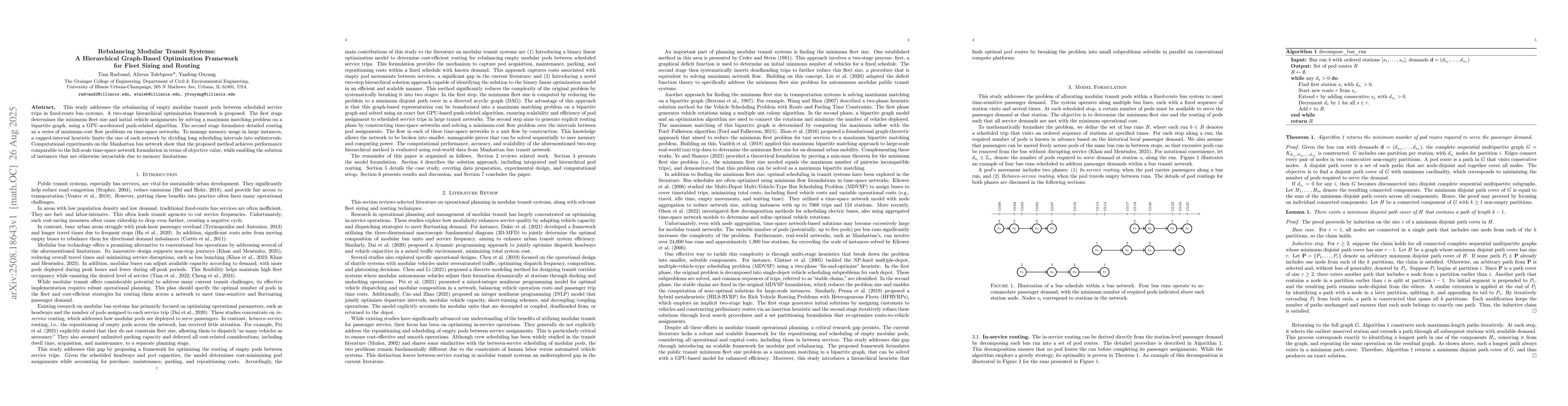 This study addresses the rebalancing of empty modular transit pods between scheduled service trips in fixed-route bus systems. A two-stage hierarchical optimization framework is proposed. The first stage determines the minimum fleet size and initial vehicle assignments by solving a maximum matching problem on a bipartite graph, using a GPU-accelerated push-relabel algorithm. The second stage formulates detailed routing as a series of minimum-cost flow problems on time-space networks. To manage memory usage in large instances, a capped-interval heuristic limits the size of each network by dividing long scheduling intervals into subintervals. Computational experiments on the Manhattan bus network show that the proposed method achieves performance comparable to the full-scale time-space network formulation in terms of objective value, while enabling the solution of instances that are otherwise intractable due to memory limitations.