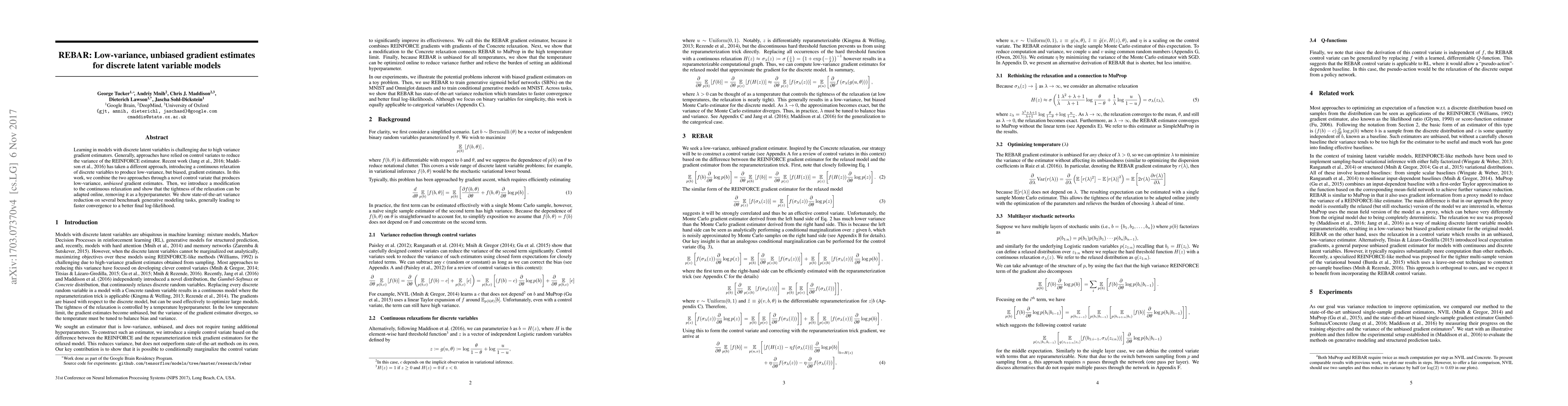 This paper introduces REBAR, a method for generating low-variance, unbiased gradient estimates in models with discrete latent variables by combining control variates and adaptive continuous relaxation, leading to faster convergence and better final log-likelihood on benchmark tasks.