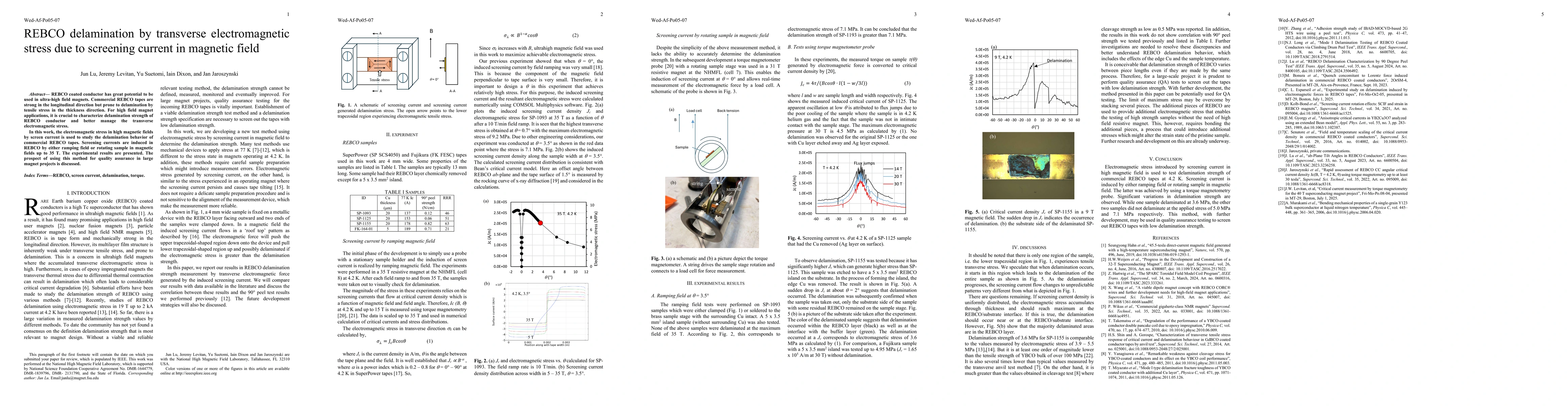 REBCO coated conductor has great potential to be used in ultra-high field magnets. Commercial REBCO tapes are strong in the longitudinal direction but prone to delamination by tensile stress in the thickness direction. For high field magnet applications, it is crucial to characterize delamination strength of REBCO conductor and better manage the transverse electromagnetic stress. In this work, the electromagnetic stress in high magnetic fields by screen current is used to study the delamination behavior of commercial REBCO tapes. Screening currents are induced in REBCO by either ramping field or rotating sample in magnetic fields up to 35 T. The experimental results are presented. The prospect of using this method for quality assurance in large magnet projects is discussed.
