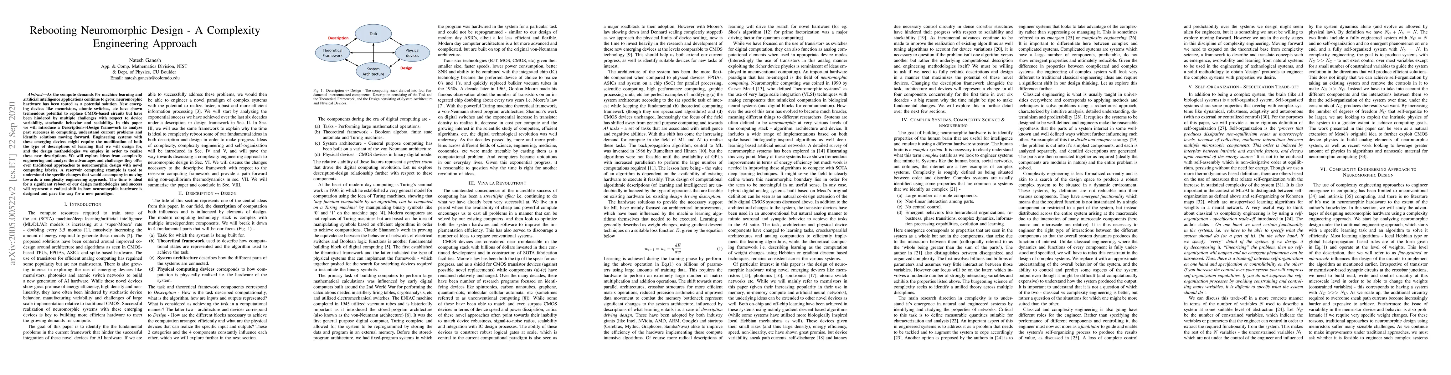 As the compute demands for machine learning and artificial intelligence applications continue to grow, neuromorphic hardware has been touted as a potential solution. New emerging devices like memristors, atomic switches, etc have shown tremendous potential to replace CMOS-based circuits but have been hindered by multiple challenges with respect to device variability, stochastic behavior and scalability. In this paper we will introduce a Description<->Design framework to analyze past successes in computing, understand current problems and identify solutions moving forward. Engineering systems with these emerging devices might require the modification of both the type of descriptions of learning that we will design for, and the design methodologies we employ in order to realize these new descriptions. We will explore ideas from complexity engineering and analyze the advantages and challenges they offer over traditional approaches to neuromorphic design with novel computing fabrics. A reservoir computing example is used to understand the specific changes that would accompany in moving towards a complexity engineering approach. The time is ideal for a significant reboot of our design methodologies and success will represent a radical shift in how neuromorphic hardware is designed and pave the way for a new paradigm.