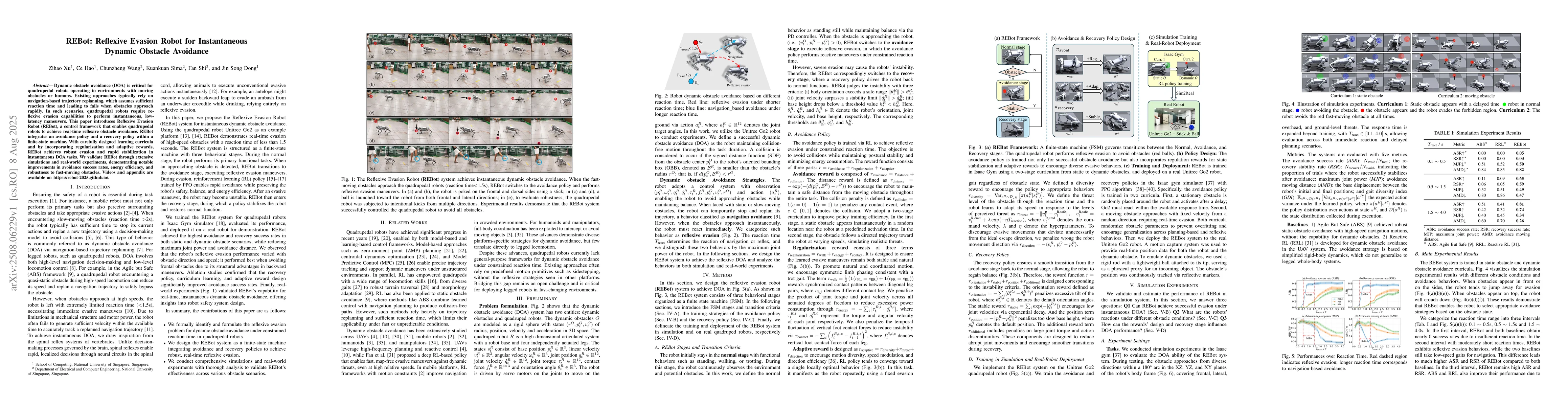 Dynamic obstacle avoidance (DOA) is critical for quadrupedal robots operating in environments with moving obstacles or humans. Existing approaches typically rely on navigation-based trajectory replanning, which assumes sufficient reaction time and leading to fails when obstacles approach rapidly. In such scenarios, quadrupedal robots require reflexive evasion capabilities to perform instantaneous, low-latency maneuvers. This paper introduces Reflexive Evasion Robot (REBot), a control framework that enables quadrupedal robots to achieve real-time reflexive obstacle avoidance. REBot integrates an avoidance policy and a recovery policy within a finite-state machine. With carefully designed learning curricula and by incorporating regularization and adaptive rewards, REBot achieves robust evasion and rapid stabilization in instantaneous DOA tasks. We validate REBot through extensive simulations and real-world experiments, demonstrating notable improvements in avoidance success rates, energy efficiency, and robustness to fast-moving obstacles. Videos and appendix are available on https://rebot-2025.github.io/.