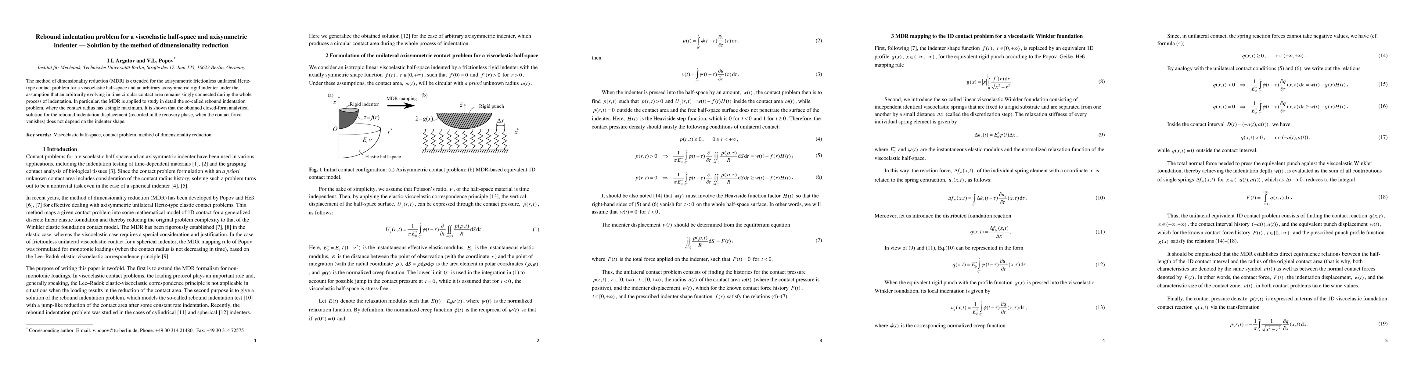 The method of dimensionality reduction (MDR) is extended for the axisymmetric frictionless unilateral Hertz-type contact problem for a viscoelastic half-space and an arbitrary axisymmetric rigid indenter under the assumption that an arbitrarily evolving in time circular contact area remains singly connected during the whole process of indentation. In particular, the MDR is applied to study in detail the so-called rebound indentation problem, where the contact radius has a single maximum. It is shown that the obtained closed-form analytical solution for the rebound indentation displacement (recorded in the recovery phase, when the contact force vanishes) does not depend on the indenter shape.