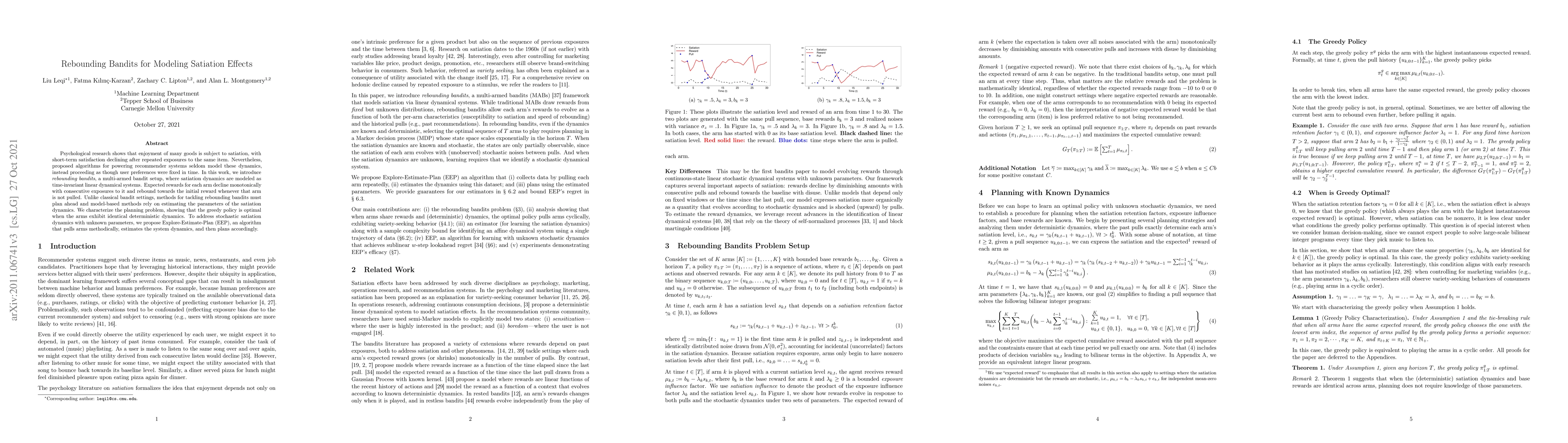 Psychological research shows that enjoyment of many goods is subject to satiation, with short-term satisfaction declining after repeated exposures to the same item. Nevertheless, proposed algorithms for powering recommender systems seldom model these dynamics, instead proceeding as though user preferences were fixed in time. In this work, we introduce rebounding bandits, a multi-armed bandit setup, where satiation dynamics are modeled as time-invariant linear dynamical systems. Expected rewards for each arm decline monotonically with consecutive exposures to it and rebound towards the initial reward whenever that arm is not pulled. Unlike classical bandit settings, methods for tackling rebounding bandits must plan ahead and model-based methods rely on estimating the parameters of the satiation dynamics. We characterize the planning problem, showing that the greedy policy is optimal when the arms exhibit identical deterministic dynamics. To address stochastic satiation dynamics with unknown parameters, we propose Explore-Estimate-Plan (EEP), an algorithm that pulls arms methodically, estimates the system dynamics, and then plans accordingly.