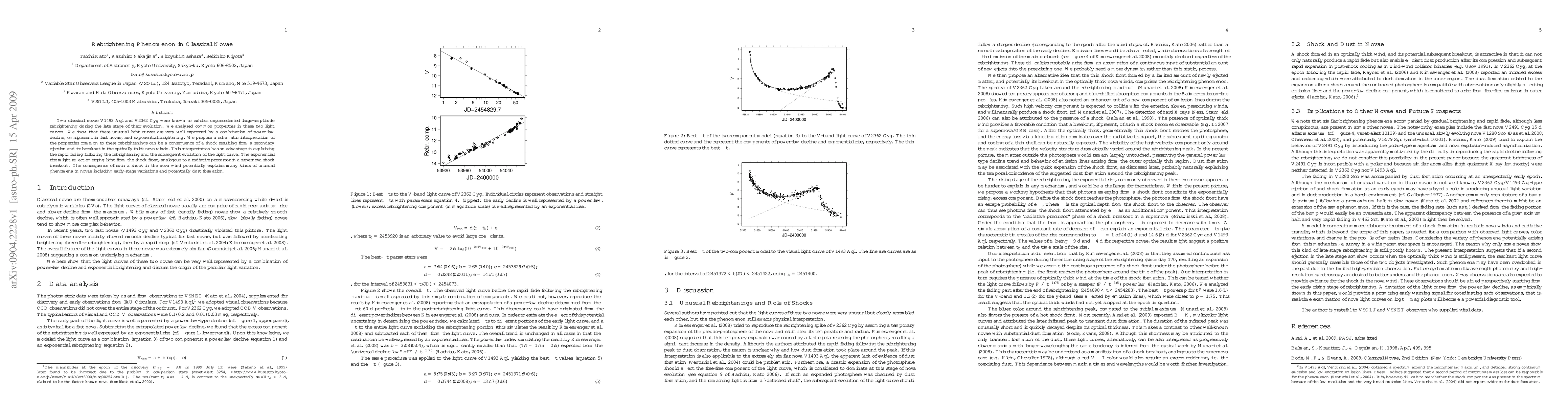 Two classical novae exhibited unusual rebrightening during late stages; their light curves were explained by a shock from secondary ejection in optically thick nova winds.