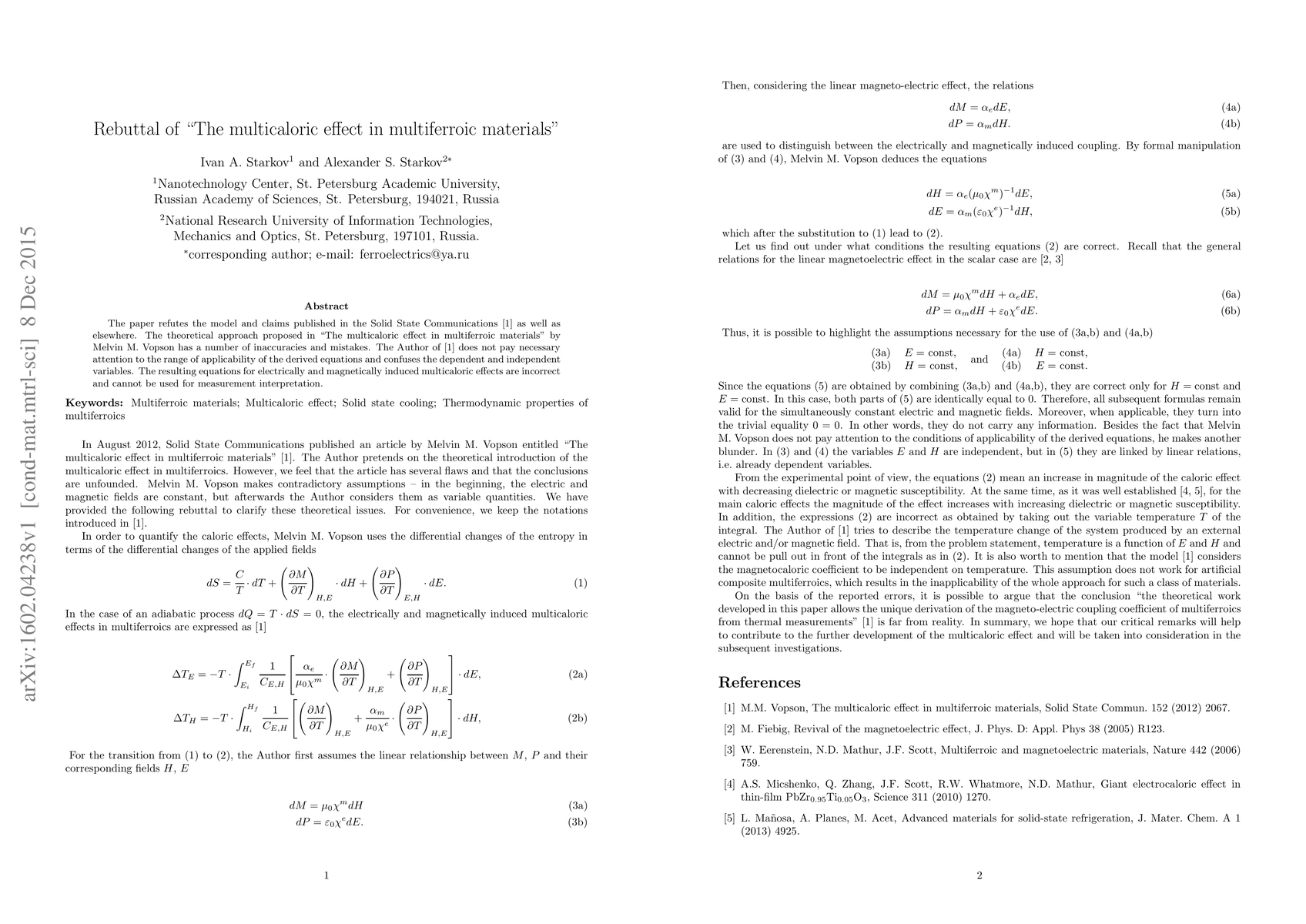 The paper refutes the model and claims published in the Solid State Communications [1] as well as elsewhere. The theoretical approach proposed in "The multicaloric effect in multiferroic materials" by Melvin M.~Vopson has a number of inaccuracies and mistakes. The Author of [1] does not pay necessary attention to the range of applicability of the derived equations and confuses the dependent and independent variables. The resulting equations for electrically and magnetically induced multicaloric effects are incorrect and cannot be used for measurement interpretation.
