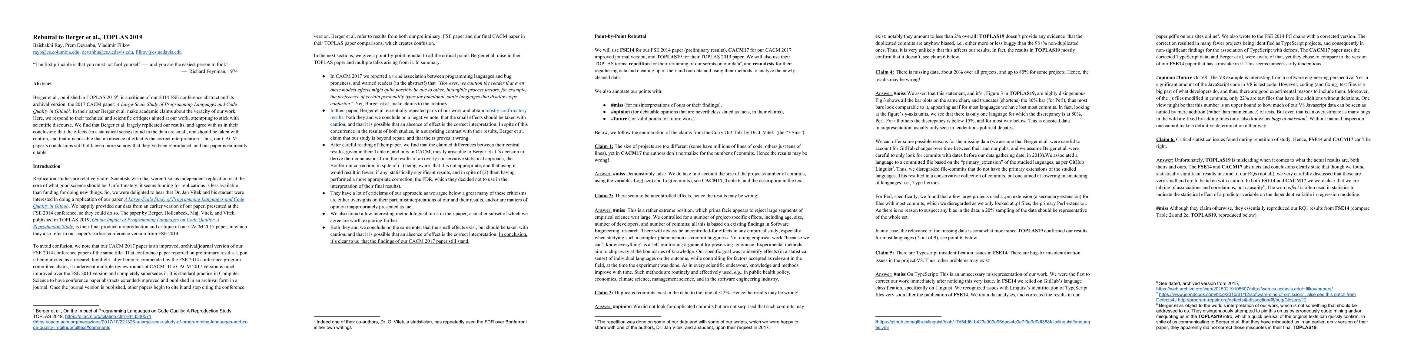 Berger et al., published in TOPLAS 2019, is a critique of our 2014 FSE conference abstract and its archival version, the 2017 CACM paper: A Large-Scale Study of Programming Languages and Code Quality in Github. In their paper Berger et al. make academic claims about the veracity of our work. Here, we respond to their technical and scientific critiques aimed at our work, attempting to stick with scientific discourse. We find that Berger et al. largely replicated our results, and agree with us in their conclusion: that the effects (in a statistical sense) found in the data are small, and should be taken with caution, and that it is possible that an absence of effect is the correct interpretation. Thus, our CACM paper's conclusions still hold, even more so now that they have been reproduced, and our paper is eminently citable.