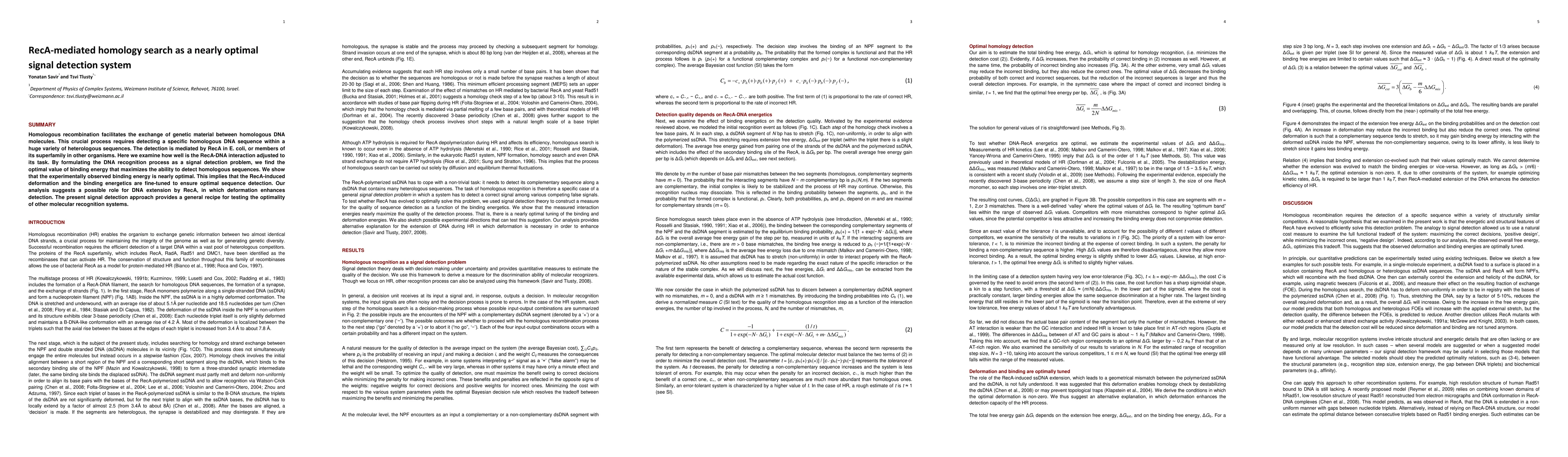 This research analyzes the RecA protein's role in detecting homologous DNA sequences, showing that its binding energy is nearly optimal for this task. The study suggests RecA-induced DNA deformation enhances detection, offering a framework to test other molecular recognition systems' optimality.