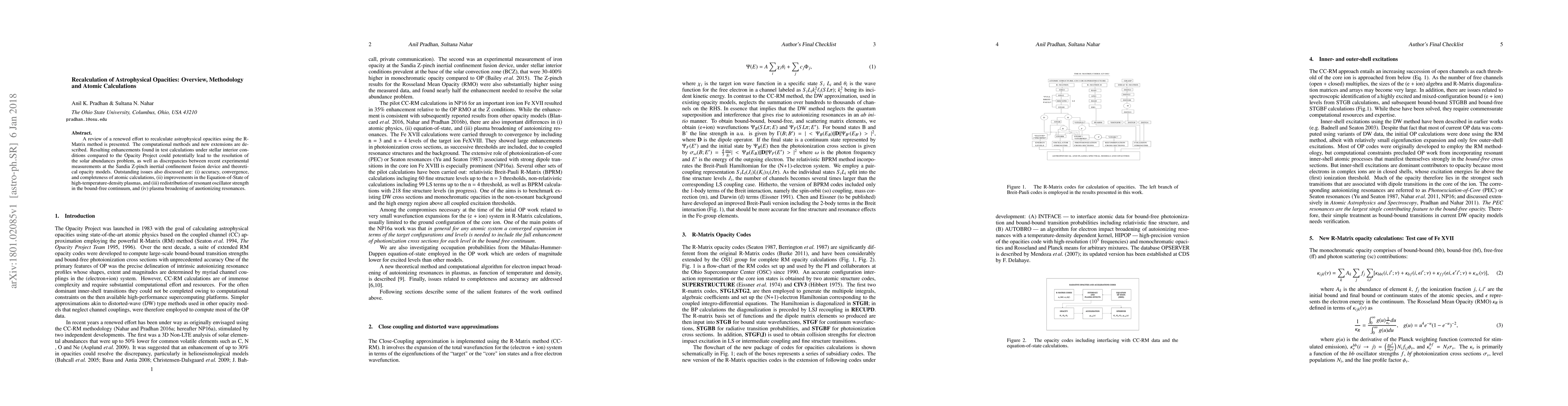 The research employs the R-Matrix method for recalculating astrophysical opacities, utilizing codes like INTERFACE, AUTOBRO, HIPOP, and OPSERVER. It focuses on improving atomic calculations, Equation-of-State for high-temperature-density plasmas, and redistribution of resonant oscillator strength in the bound-free continuum.