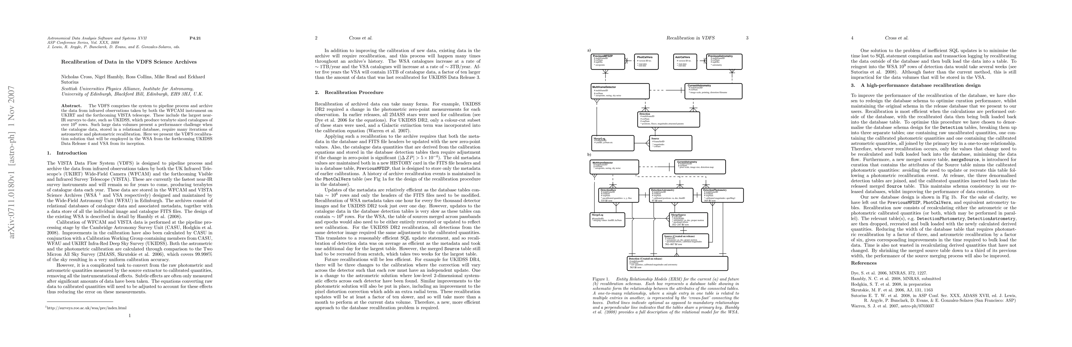 The VDFS comprises the system to pipeline process and archive the data from infrared observations taken by both the WFCAM instrument on UKIRT and the forthcoming VISTA telescope. These include the largest near-IR surveys to date, such as UKIDSS, which produce terabyte sized catalogues of over 10^9 rows. Such large data volumes present a performance challenge when the catalogue data, stored in a relational database, require many iterations of astrometric and photometric recalibration. Here we present the VDFS recalibration solution that will be employed in the WSA from the forthcoming UKIDSS Data Release 4 and VSA from its inception.