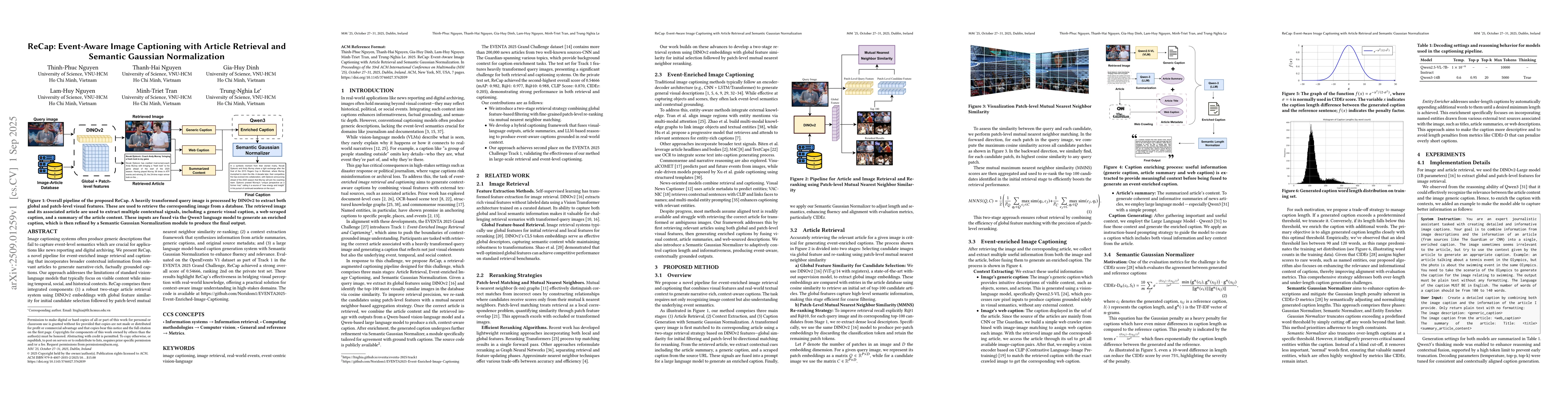 Image captioning systems often produce generic descriptions that fail to capture event-level semantics which are crucial for applications like news reporting and digital archiving. We present ReCap, a novel pipeline for event-enriched image retrieval and captioning that incorporates broader contextual information from relevant articles to generate narrative-rich, factually grounded captions. Our approach addresses the limitations of standard vision-language models that typically focus on visible content while missing temporal, social, and historical contexts. ReCap comprises three integrated components: (1) a robust two-stage article retrieval system using DINOv2 embeddings with global feature similarity for initial candidate selection followed by patch-level mutual nearest neighbor similarity re-ranking; (2) a context extraction framework that synthesizes information from article summaries, generic captions, and original source metadata; and (3) a large language model-based caption generation system with Semantic Gaussian Normalization to enhance fluency and relevance. Evaluated on the OpenEvents V1 dataset as part of Track 1 in the EVENTA 2025 Grand Challenge, ReCap achieved a strong overall score of 0.54666, ranking 2nd on the private test set. These results highlight ReCap's effectiveness in bridging visual perception with real-world knowledge, offering a practical solution for context-aware image understanding in high-stakes domains. The code is available at https://github.com/Noridom1/EVENTA2025-Event-Enriched-Image-Captioning.