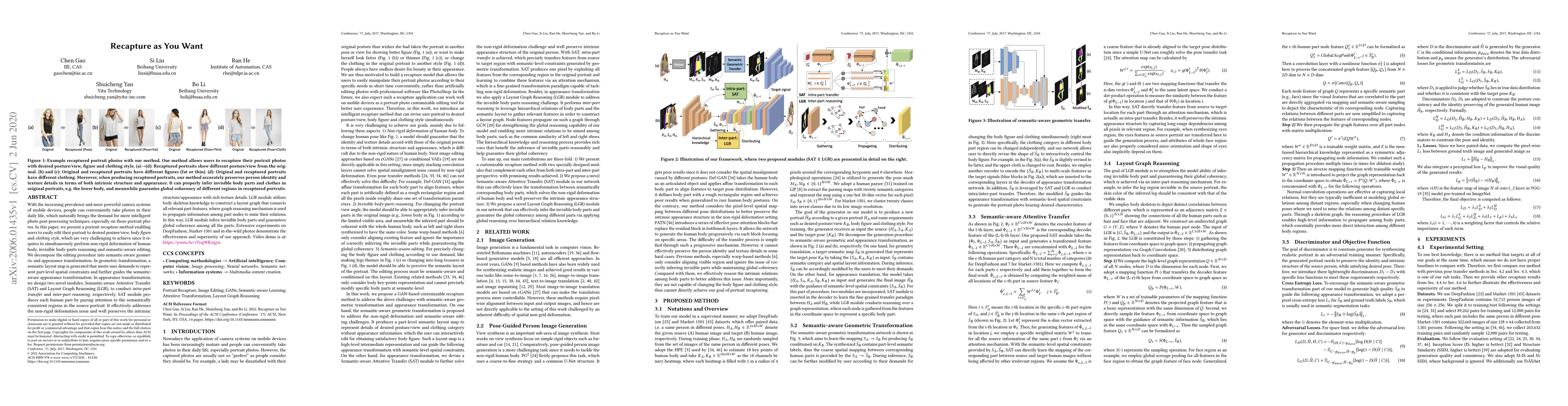 A new portrait recapture method allows users to edit their photos to desired posture, body figure, and clothing style, using a combination of geometric transformation and appearance transformation with novel modules.