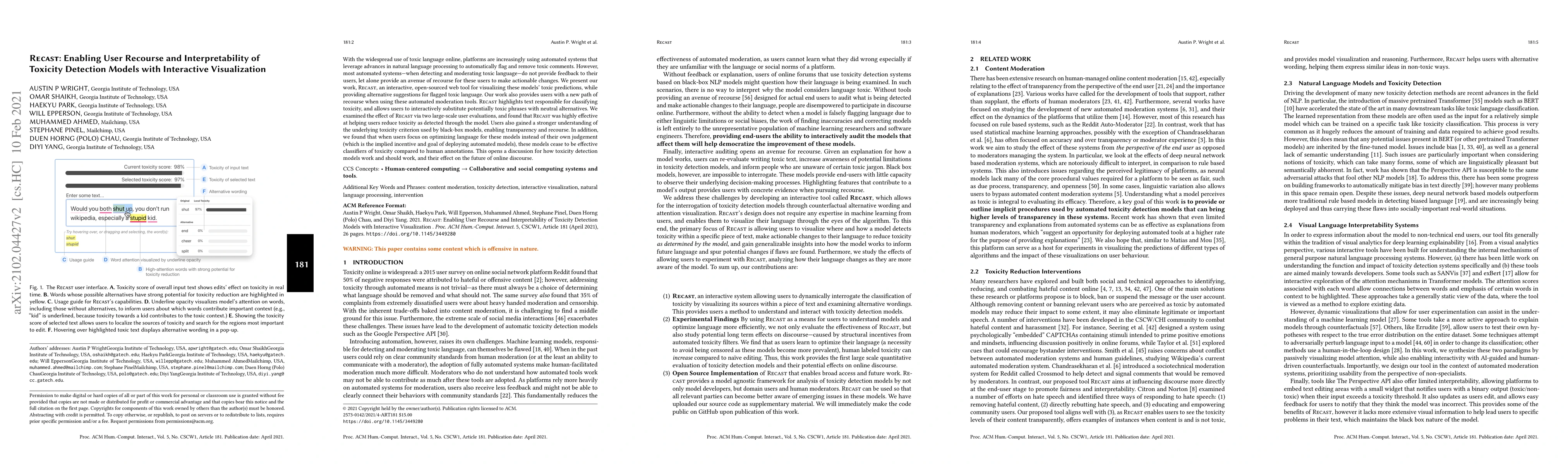 With the widespread use of toxic language online, platforms are increasingly using automated systems that leverage advances in natural language processing to automatically flag and remove toxic comments. However, most automated systems -- when detecting and moderating toxic language -- do not provide feedback to their users, let alone provide an avenue of recourse for these users to make actionable changes. We present our work, RECAST, an interactive, open-sourced web tool for visualizing these models' toxic predictions, while providing alternative suggestions for flagged toxic language. Our work also provides users with a new path of recourse when using these automated moderation tools. RECAST highlights text responsible for classifying toxicity, and allows users to interactively substitute potentially toxic phrases with neutral alternatives. We examined the effect of RECAST via two large-scale user evaluations, and found that RECAST was highly effective at helping users reduce toxicity as detected through the model. Users also gained a stronger understanding of the underlying toxicity criterion used by black-box models, enabling transparency and recourse. In addition, we found that when users focus on optimizing language for these models instead of their own judgement (which is the implied incentive and goal of deploying automated models), these models cease to be effective classifiers of toxicity compared to human annotations. This opens a discussion for how toxicity detection models work and should work, and their effect on the future of online discourse.